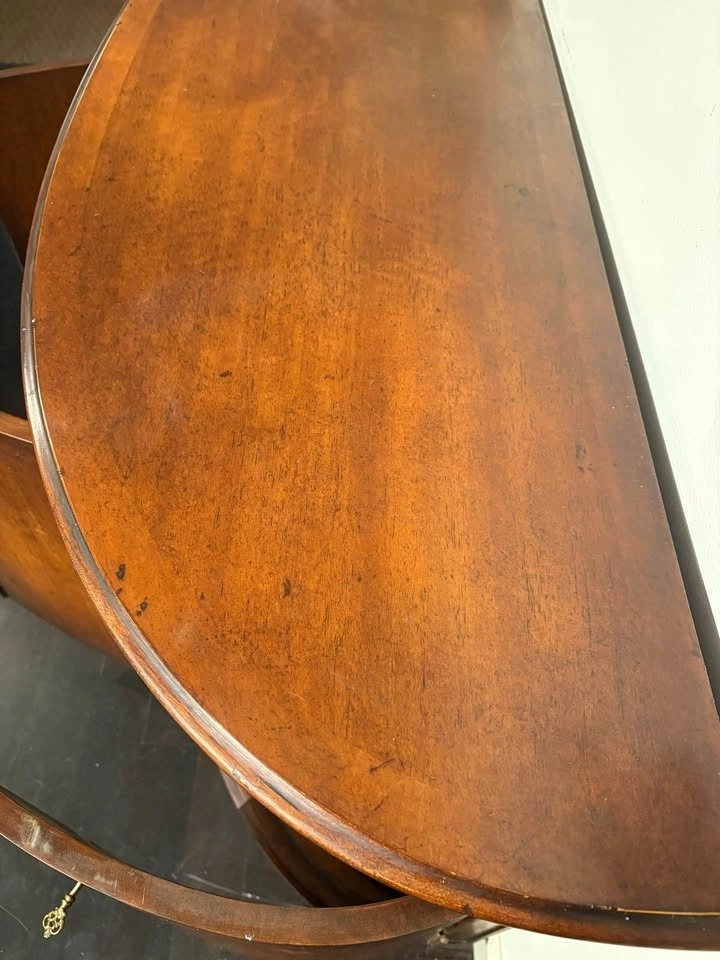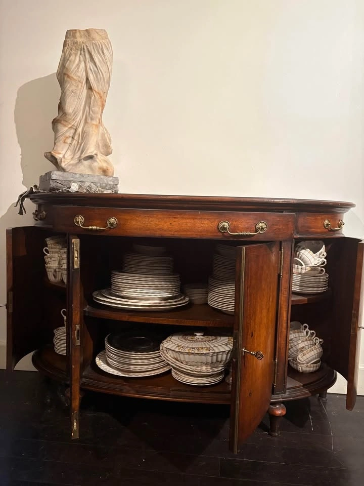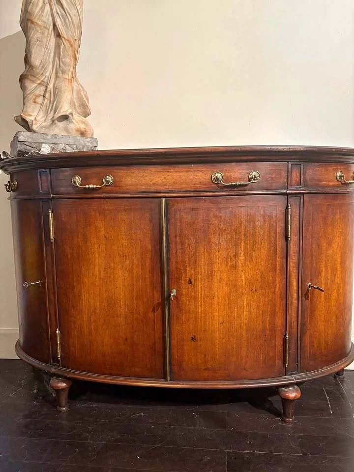 53 1/2”w x 18”d x 33 1/2”. This piece adds depth and character to living space giving a warm curated feel to any room. The hardware is solid brass and each door locks. The finish is lightly distressed and was purchased about 20 years ago directly from Theodore when at the furniture market for my business. I’ve enjoyed this piece but am downsizing.