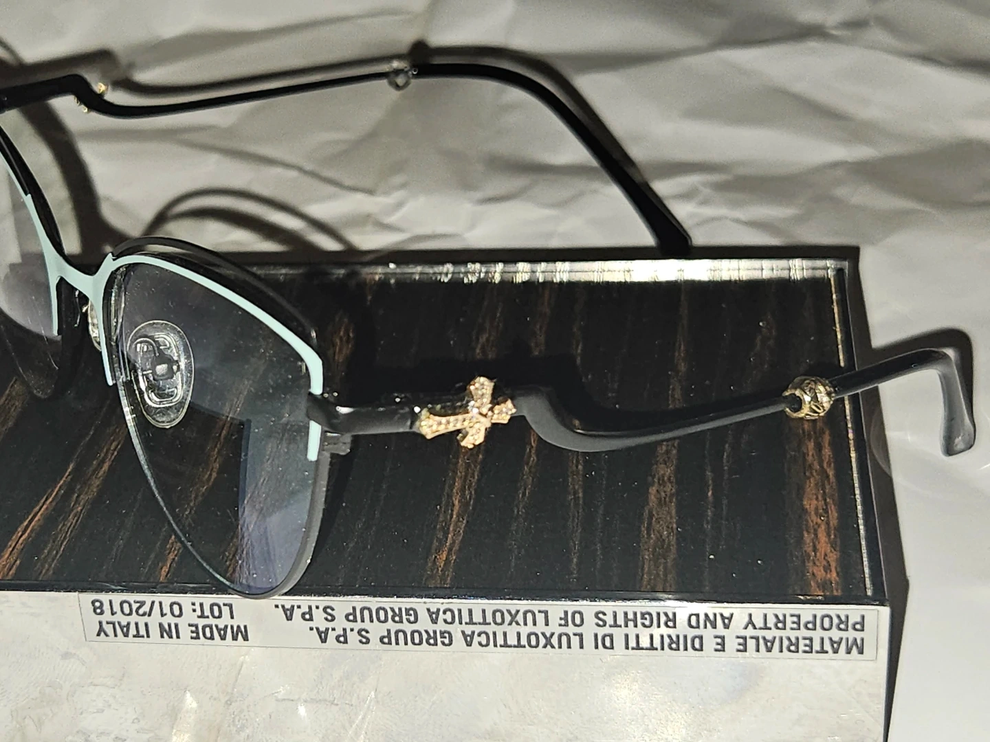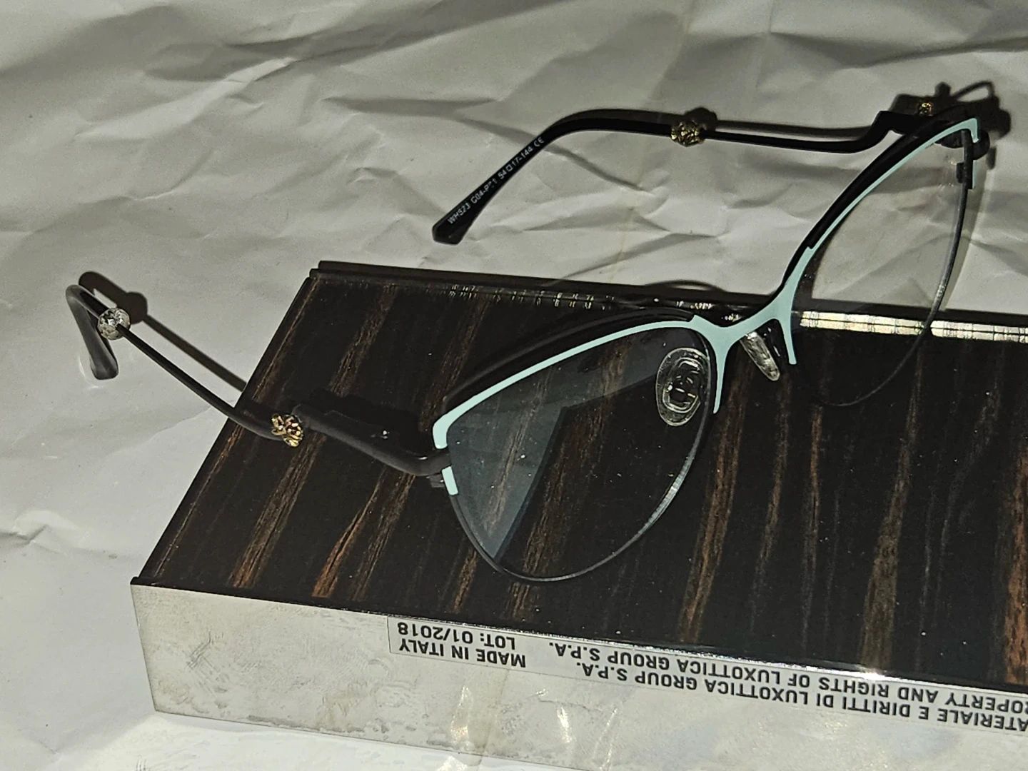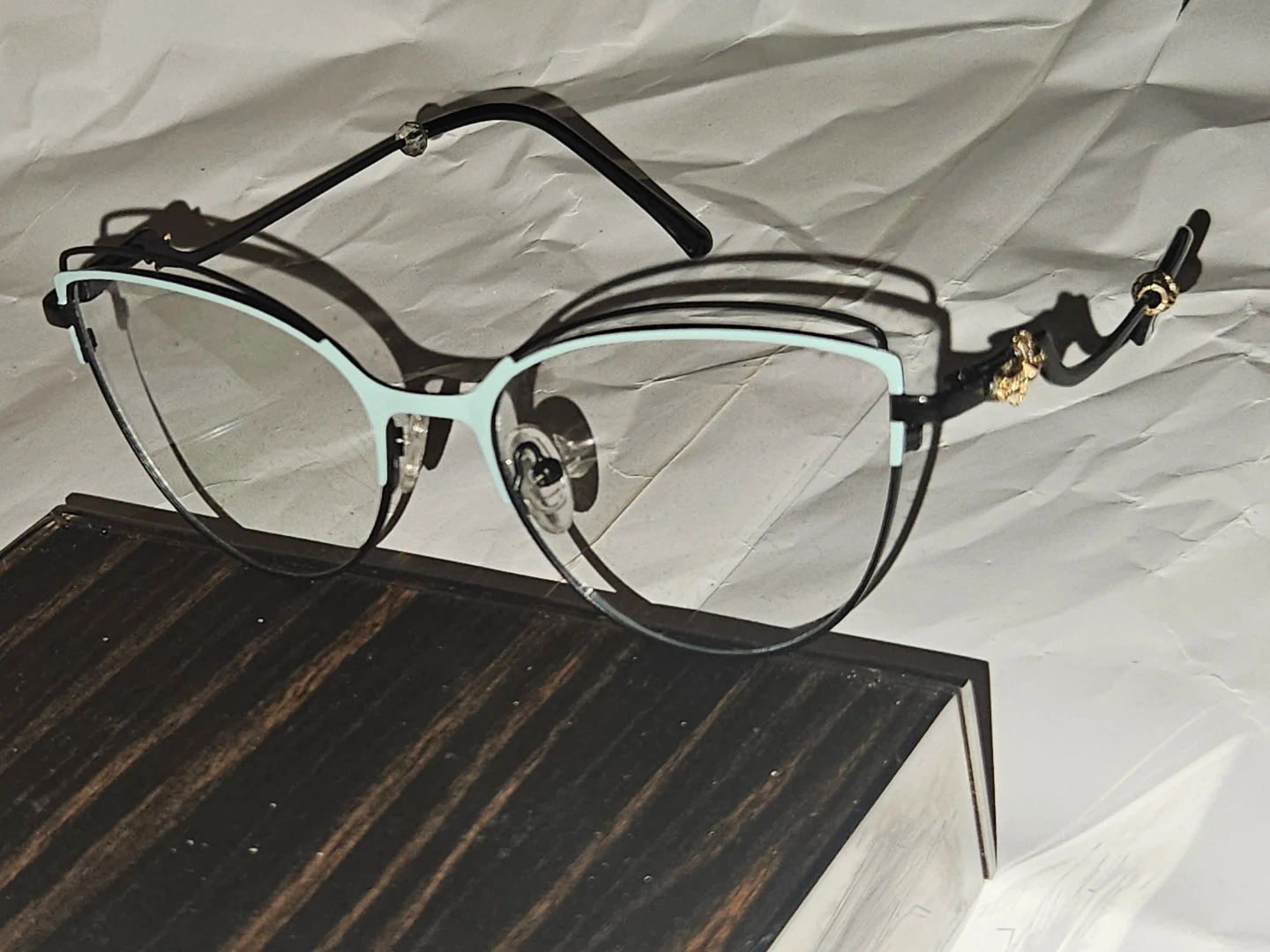 Stylish cat-eye eyeglasses featuring a light blue and black frame with intricate gold-toned cross and decorative embellishments on the temples. Made in Italy.