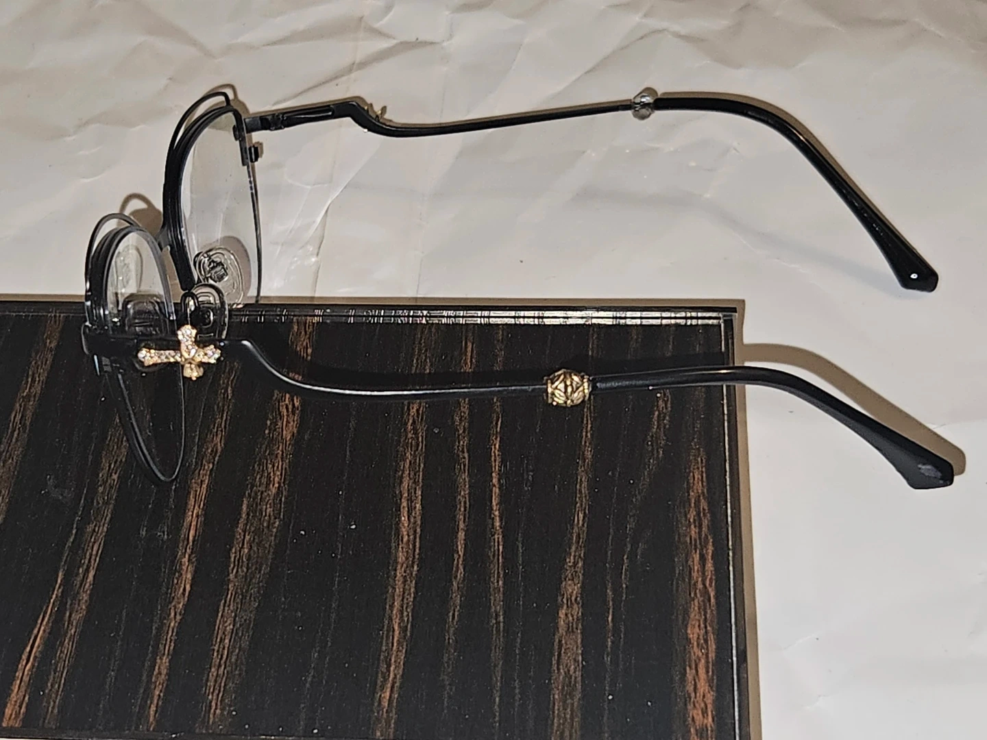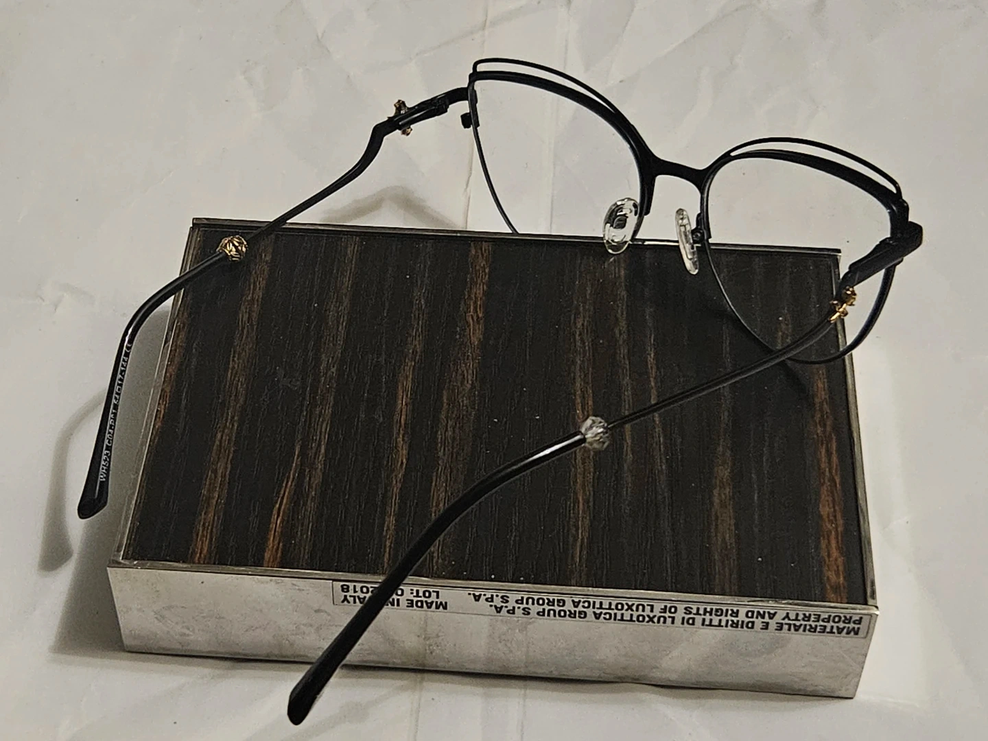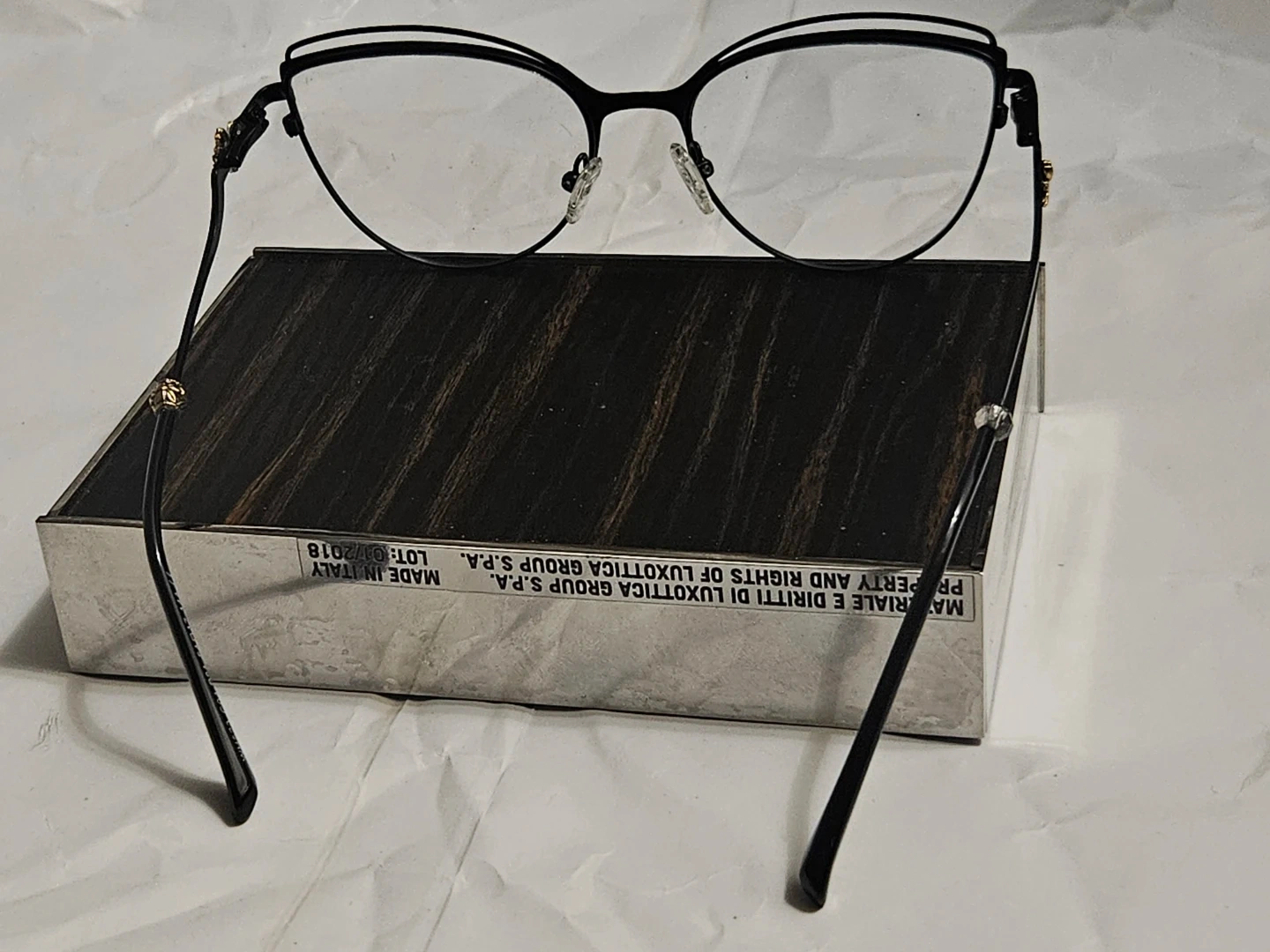 Stylish cat-eye eyeglasses featuring a light blue and black frame with intricate gold-toned cross and decorative embellishments on the temples. Made in Italy.