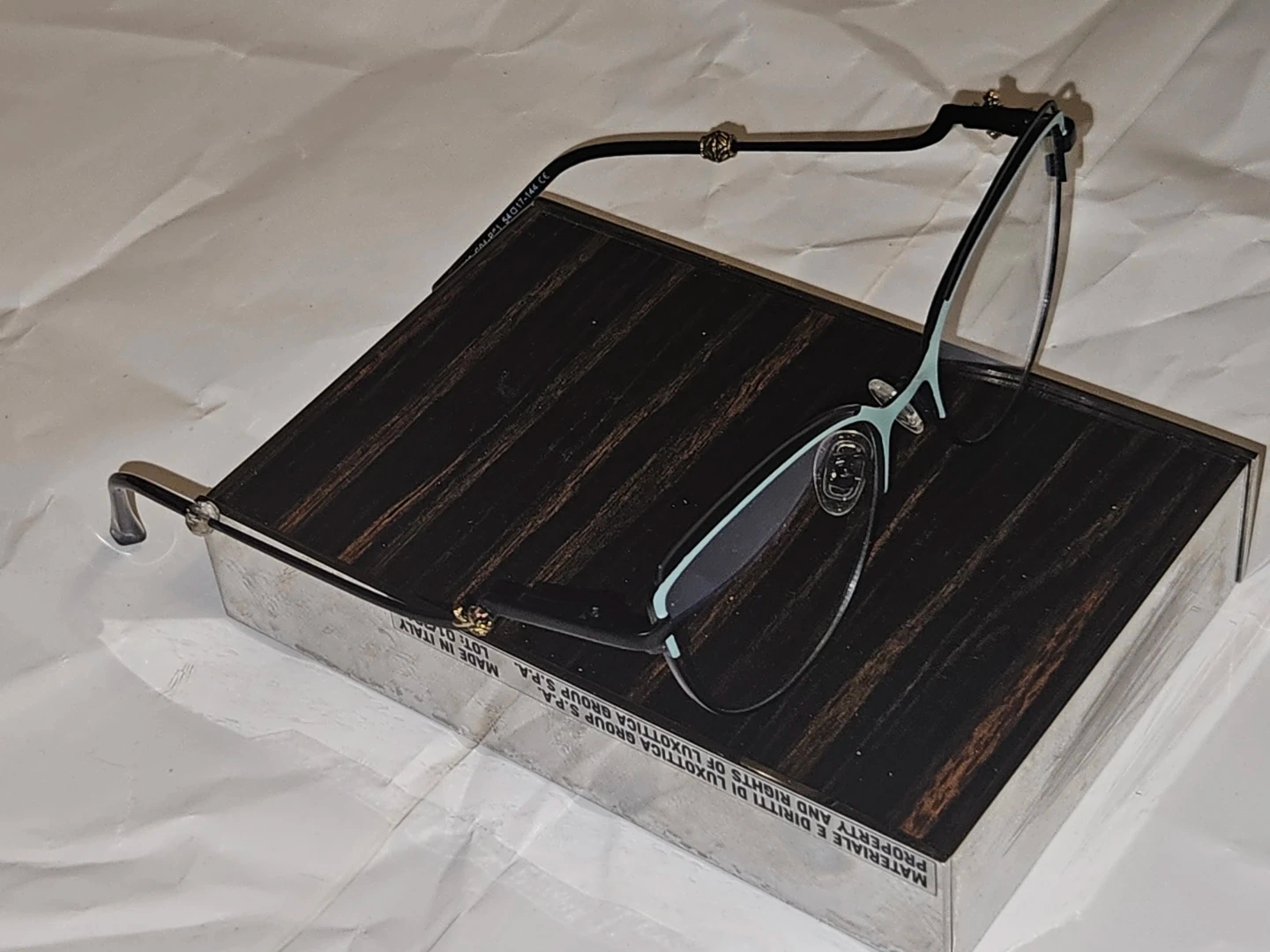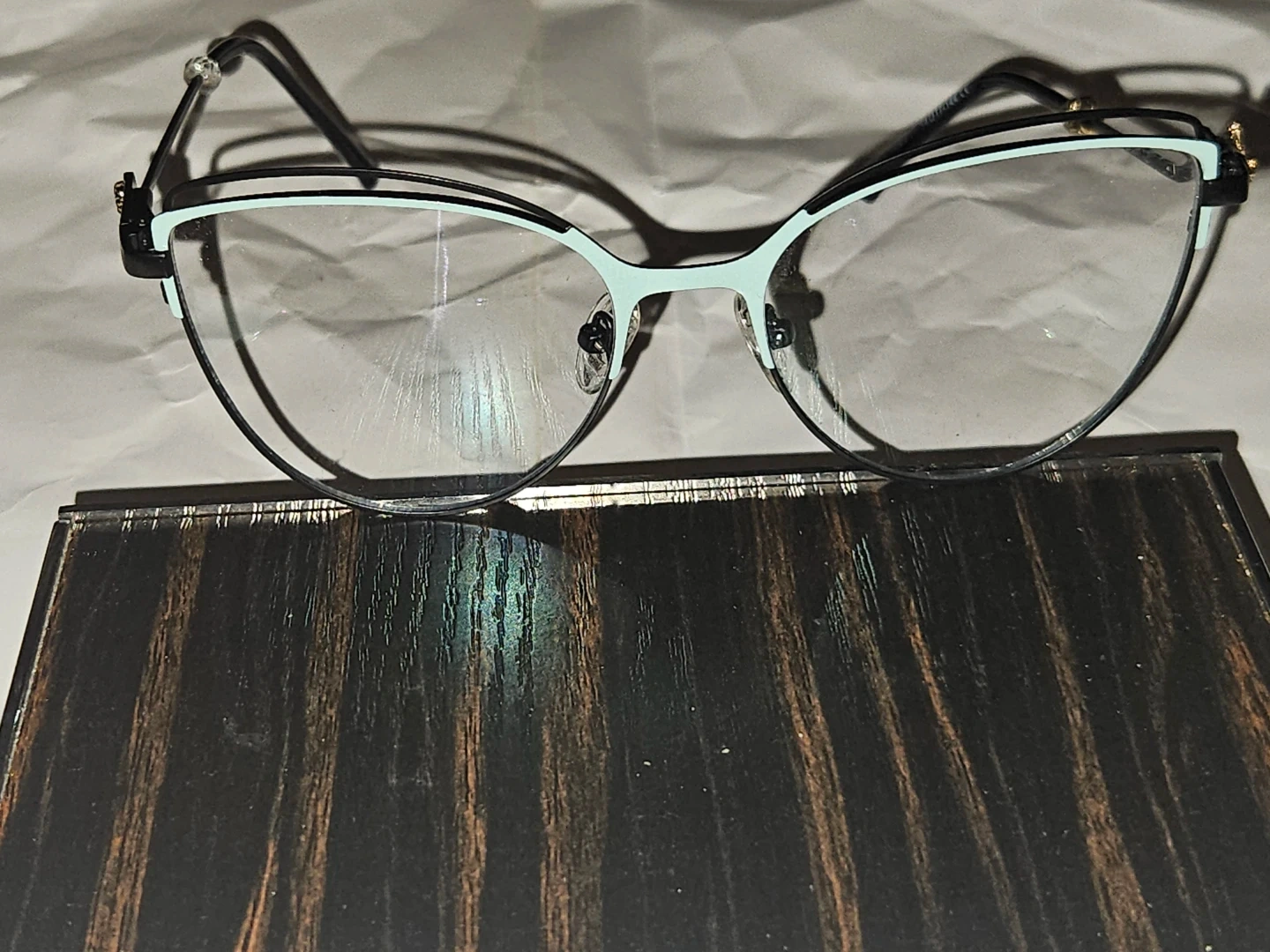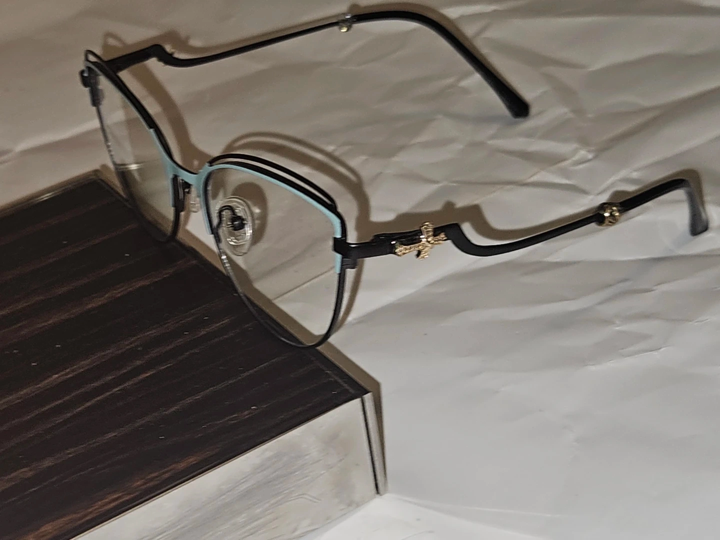 Stylish cat-eye eyeglasses featuring a light blue and black frame with intricate gold-toned cross and decorative embellishments on the temples. Made in Italy.