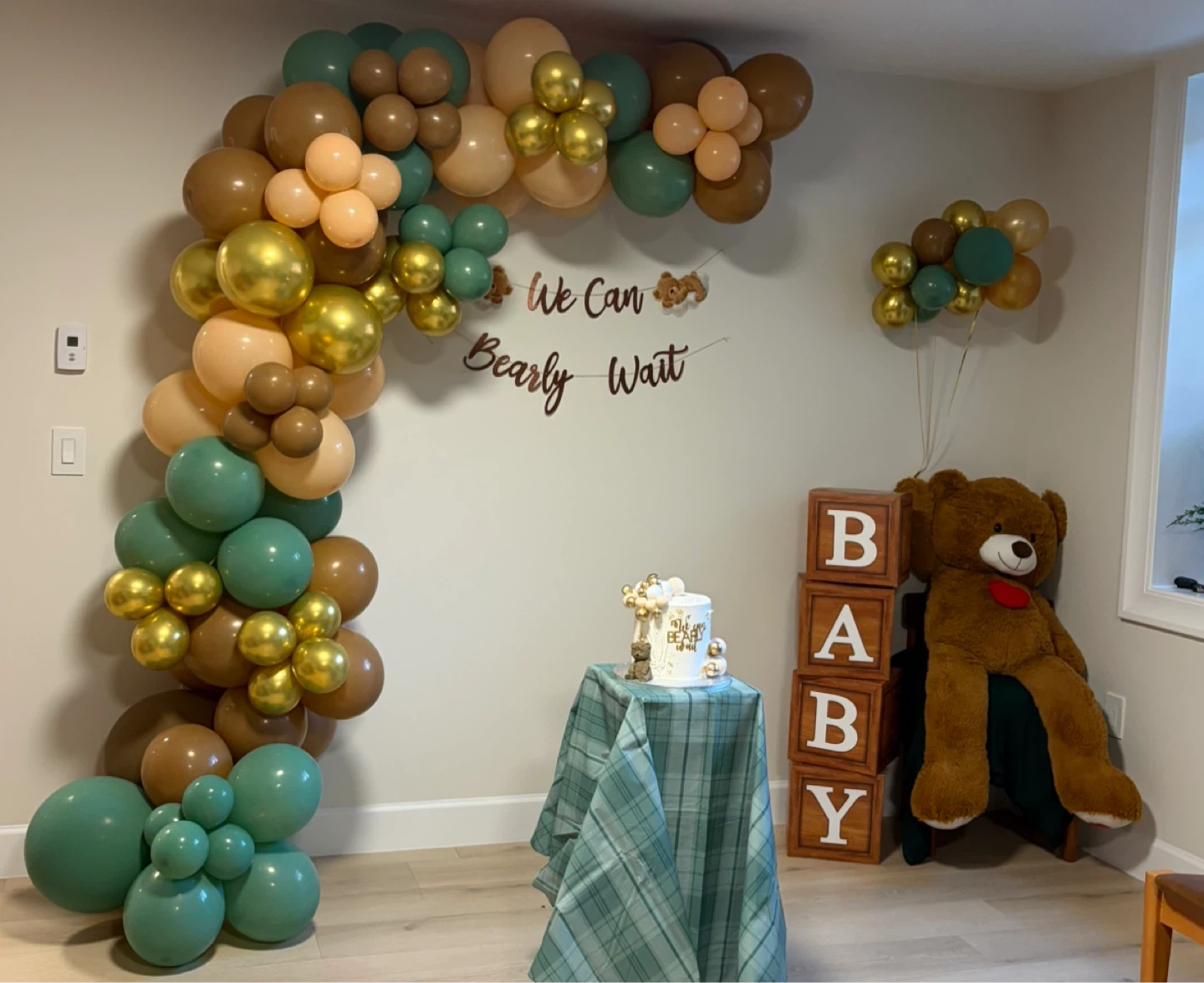 This balloon arch features a colour palette of brown, beige, gold, and teal balloons, perfect for a baby shower or any other celebration. The set includes balloons in various sizes. Used for couple hours. Includes 12ft garland and one balloon cloud. Also includes We Can bearly wait banner as well. Pickup near 96 scott road