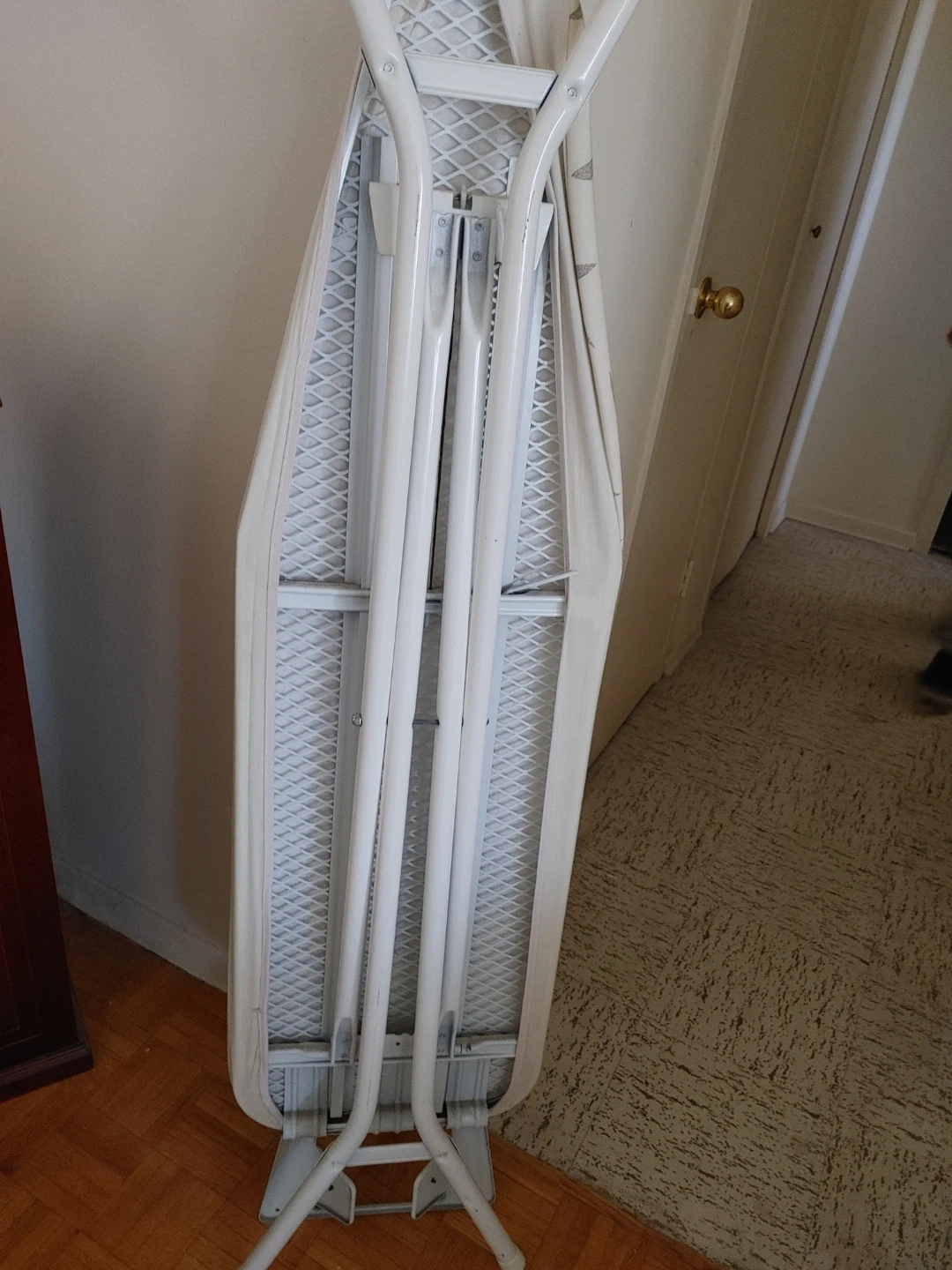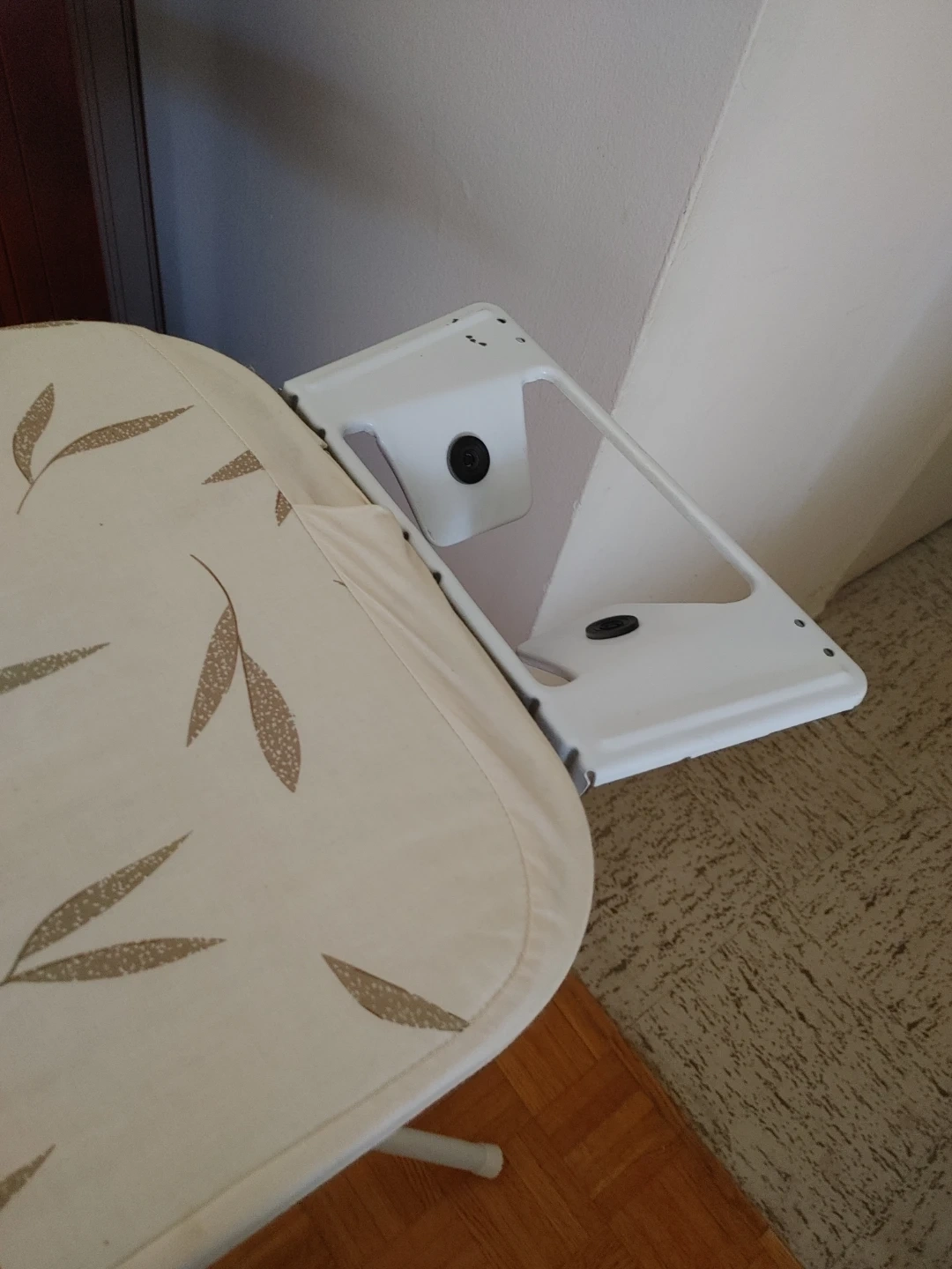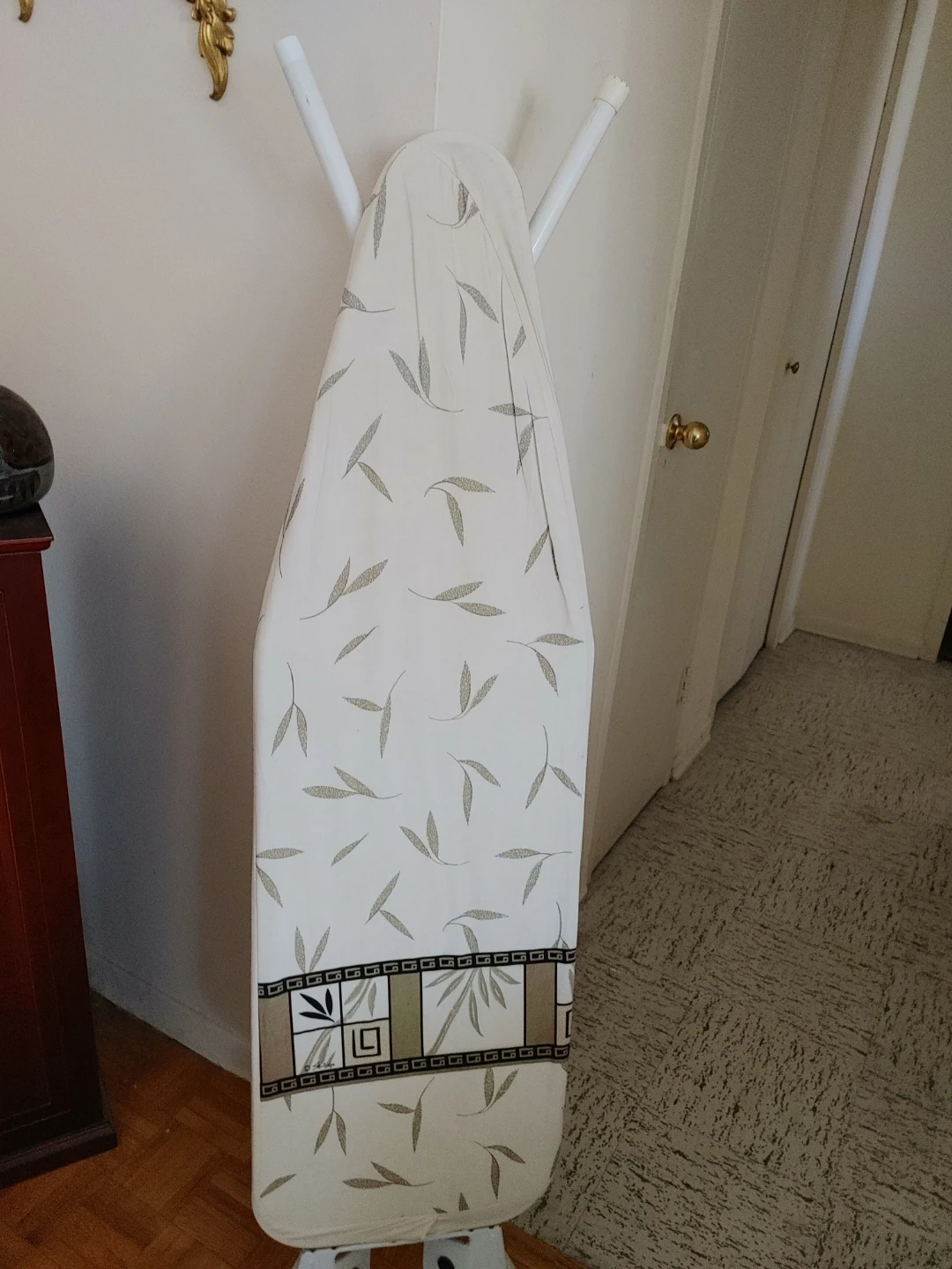 A sturdy white metal ironing board with a decorative leaf pattern cover. It's designed with a foldable frame for easy storage. Includes a built-in accessory tray.