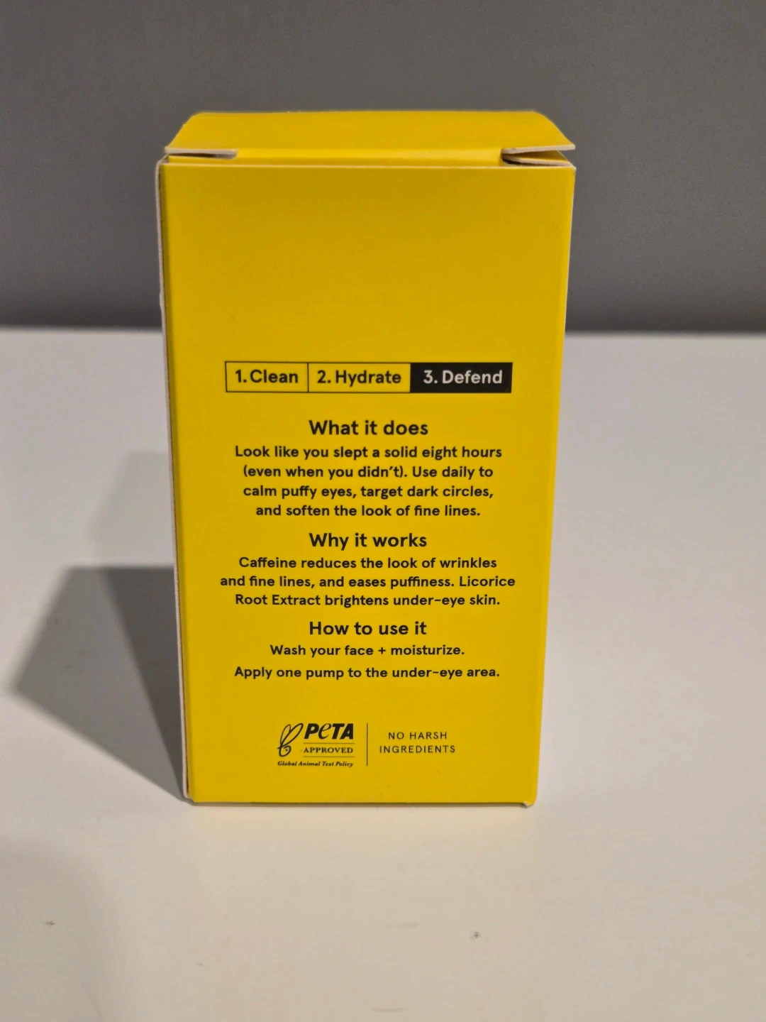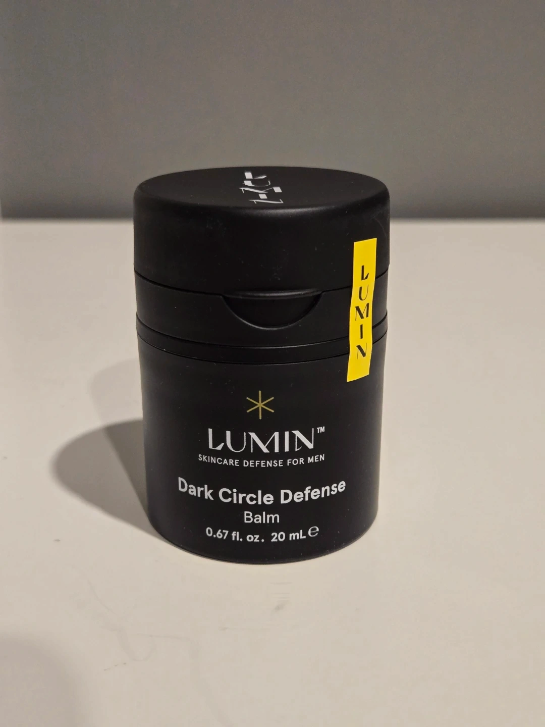 Lumin Dark Circle Defense Balm for Men. It's a 0.67 fl. oz. (20 mL) product. Caffeine helps reduce wrinkles and puffiness, while Licorice Root Extract brightens the under-eye area. Apply one pump to the under-eye area after washing and moisturizing.