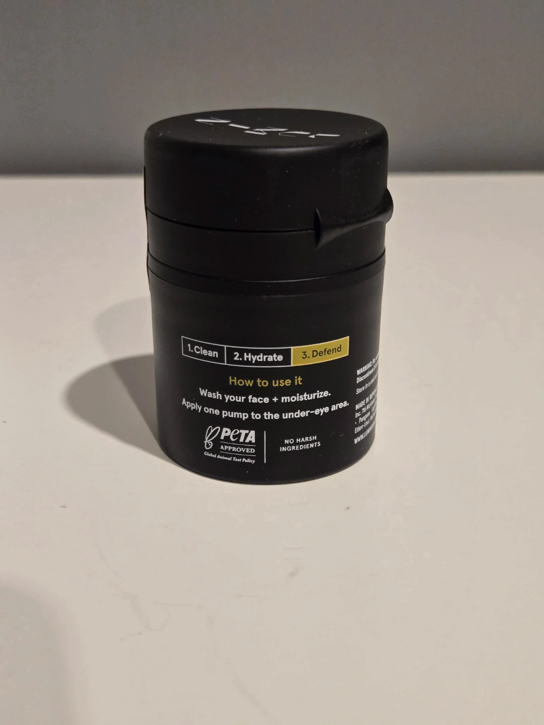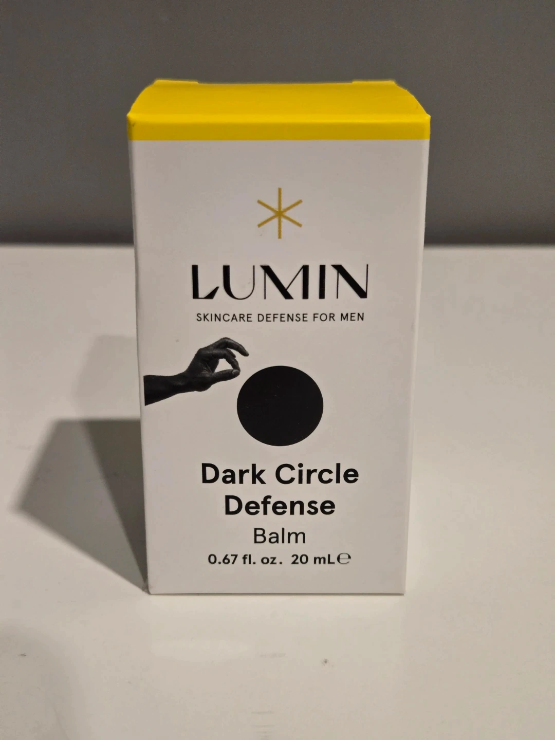 Lumin Dark Circle Defense Balm for Men. It's a 0.67 fl. oz. (20 mL) product. Caffeine helps reduce wrinkles and puffiness, while Licorice Root Extract brightens the under-eye area. Apply one pump to the under-eye area after washing and moisturizing.