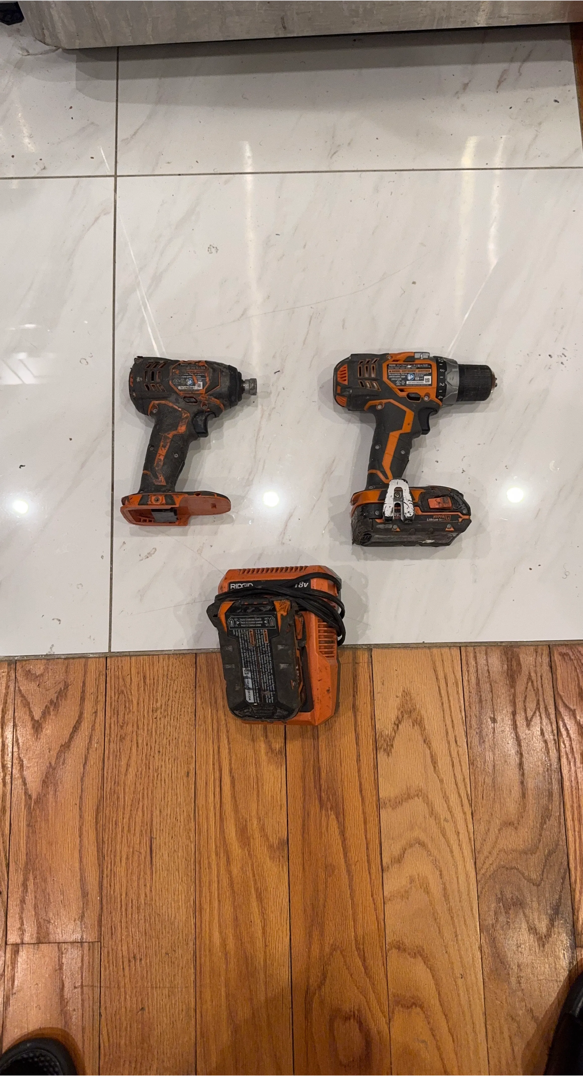 This set includes a Ridgid 18V cordless drill and a matching impact driver. Both tools are orange and black. They run on 18V lithium-ion batteries.