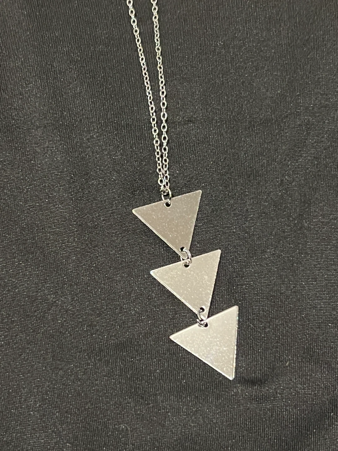 Silver-tone necklace featuring a chain with three stacked triangle pendants. Simple and modern design. Adds a subtle touch of style to any outfit.