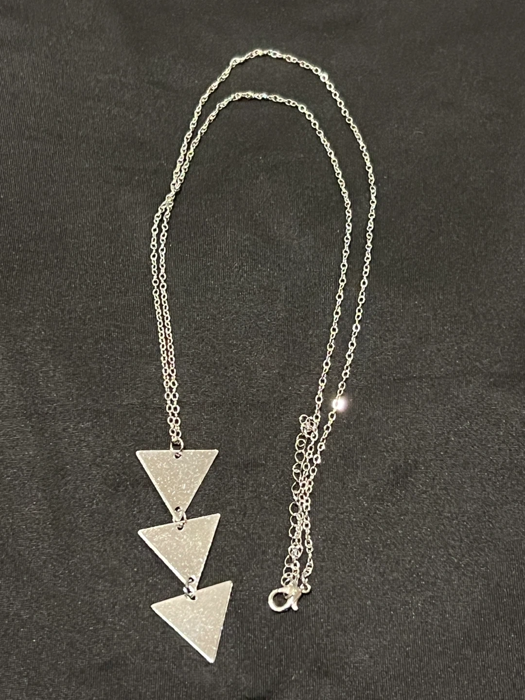 Silver-tone necklace featuring a chain with three stacked triangle pendants. Simple and modern design. Adds a subtle touch of style to any outfit.