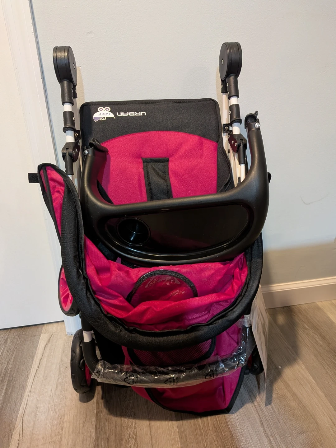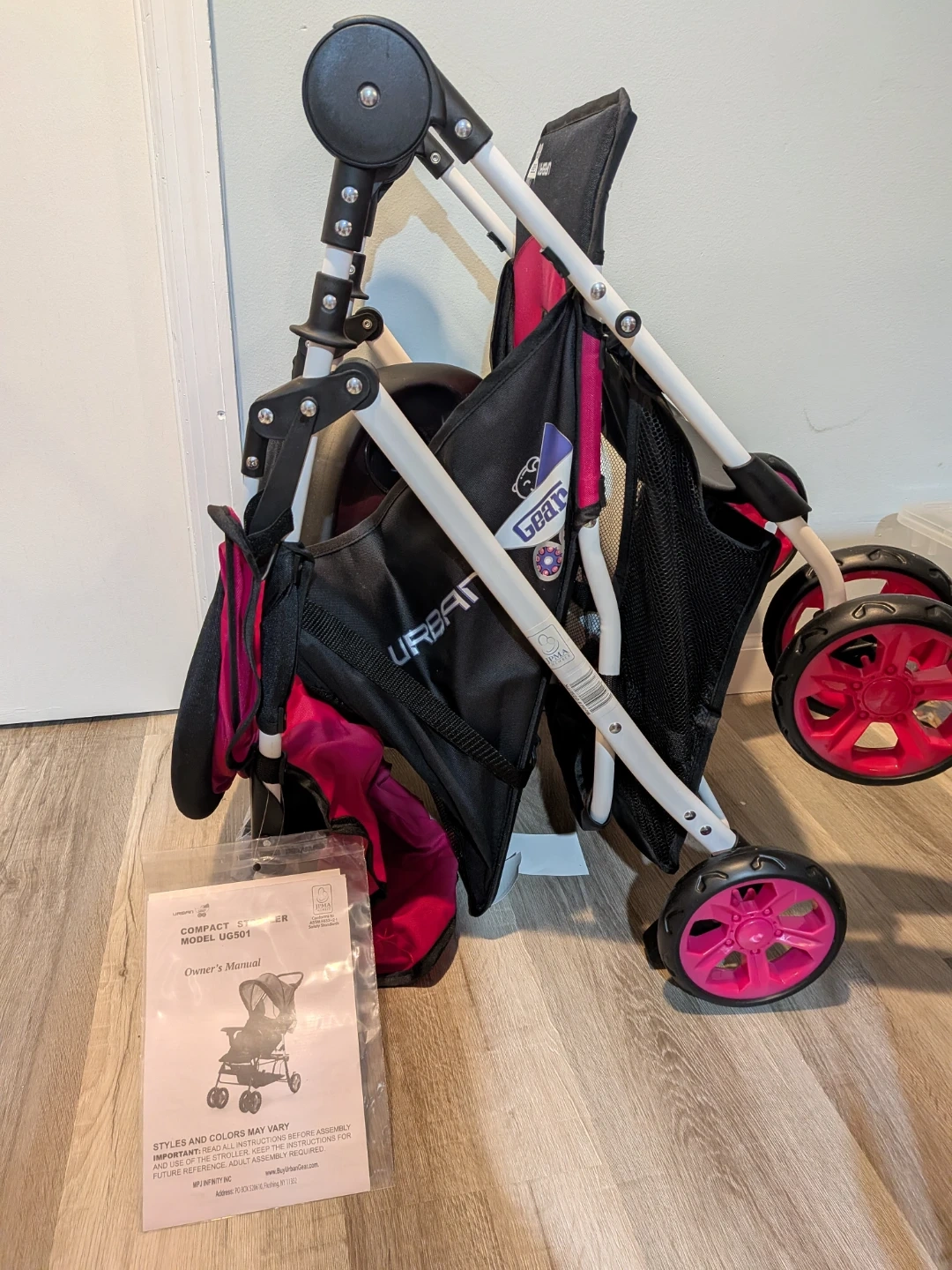 This is a brand new compact stroller by Urban Gear. It's a model UG501 with pink and black accents. It features a JPMA certification and conforms to ASTM F833-21 safety standards.