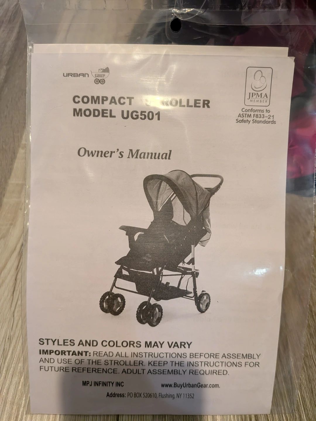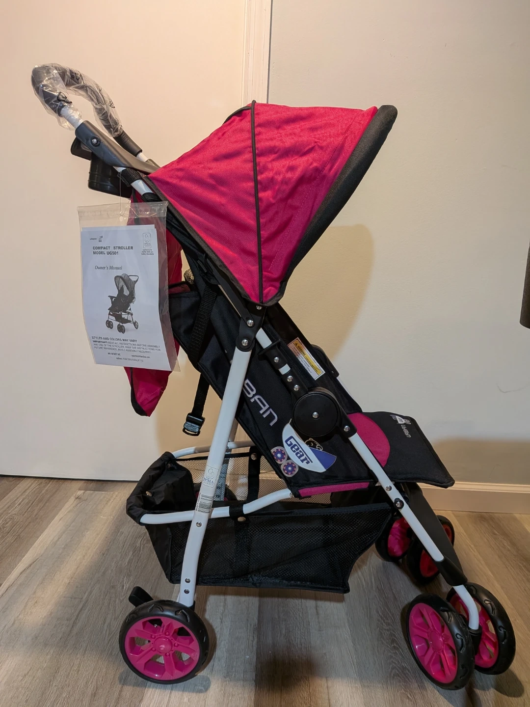 This is a brand new compact stroller by Urban Gear. It's a model UG501 with pink and black accents. It features a JPMA certification and conforms to ASTM F833-21 safety standards.