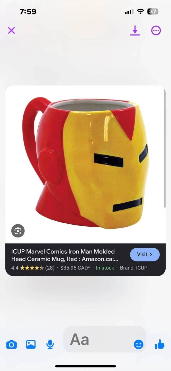Buy & SellMarvel Iron Man Ceramic MugMarvel Iron Man Ceramic Mug$14This is a Marvel Iron Man shaped ceramic mug. It features the iconic Iron Man helmet design. Hand wash only.WHERE TO MEETTim Hortons in the Co-op mallView MapSELLERJeannetteAcadia320 reviews0 chats·0 favorites·16 viewsSEND CHAT TO SELLERHi Jeannette! I’m interested in your listing.Hi Jeannette! I’m interested in your listing.Get the Karrot app to chatSign In to chat