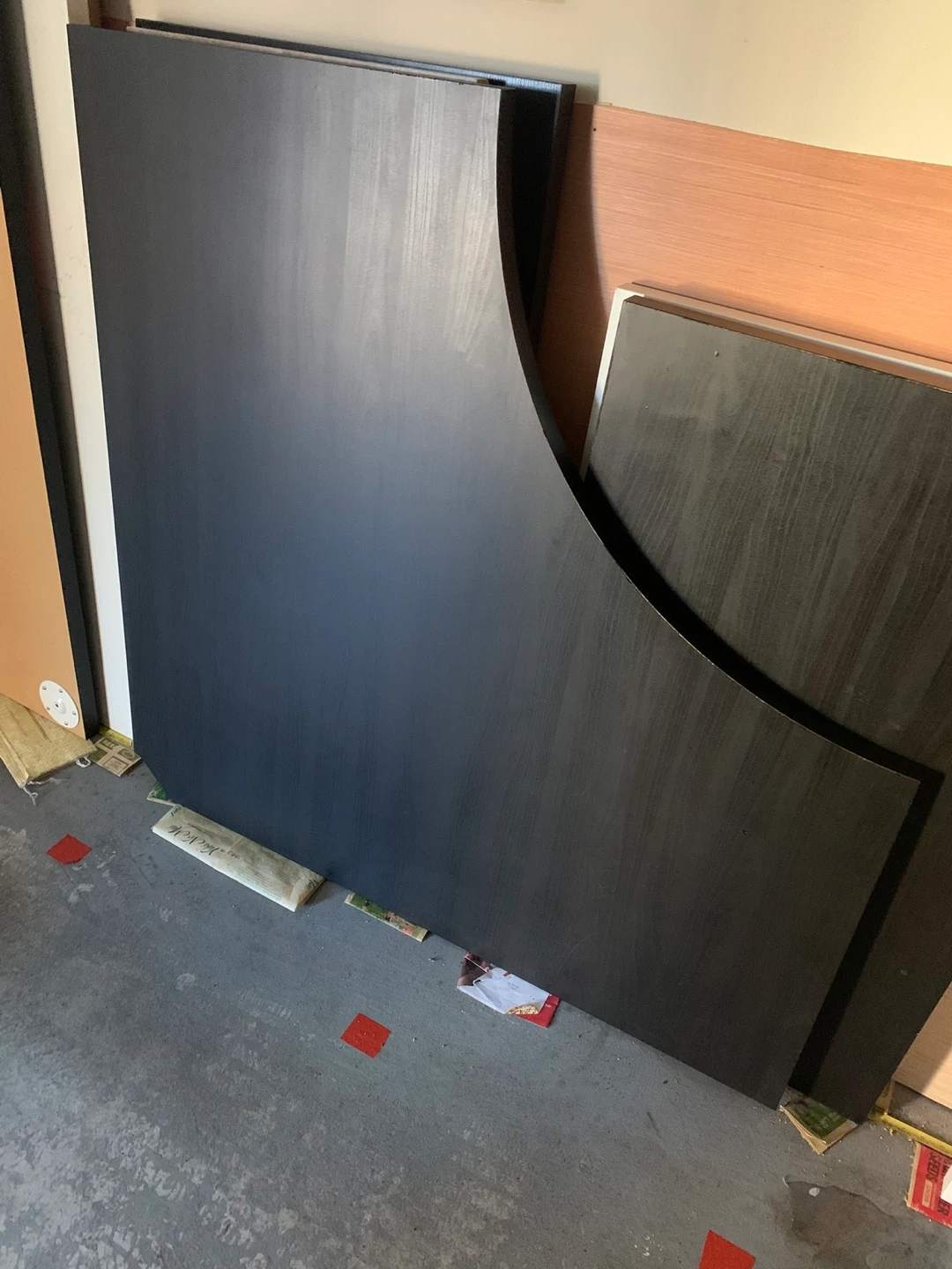 A black corner desk with legs. It's 120 cm (47 1/4") on each side and 60 cm (23 5/8") deep. This desk is perfect for a home office or study space.