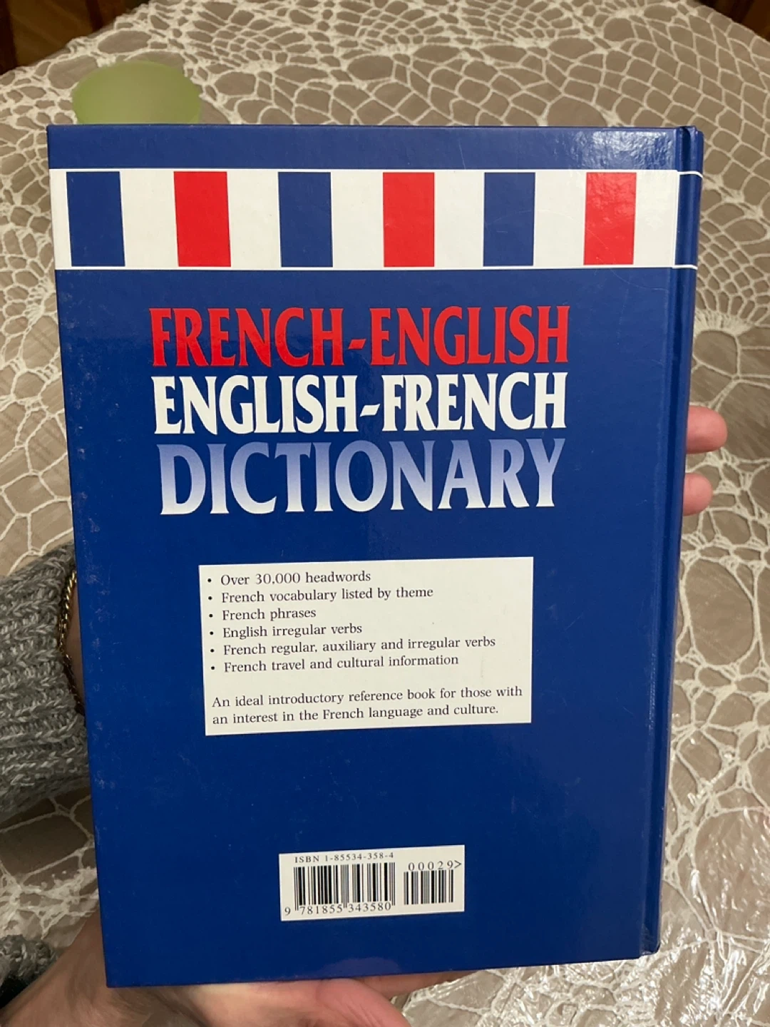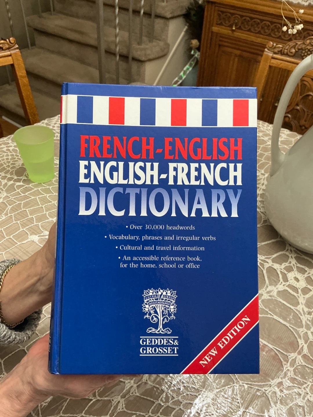 This is the "NEW EDITION" of the French-English English-French Dictionary from Geddes & Grosset. It contains over 30,000 headwords, vocabulary, phrases, and irregular verbs. It's an accessible reference book for home, school, or office.