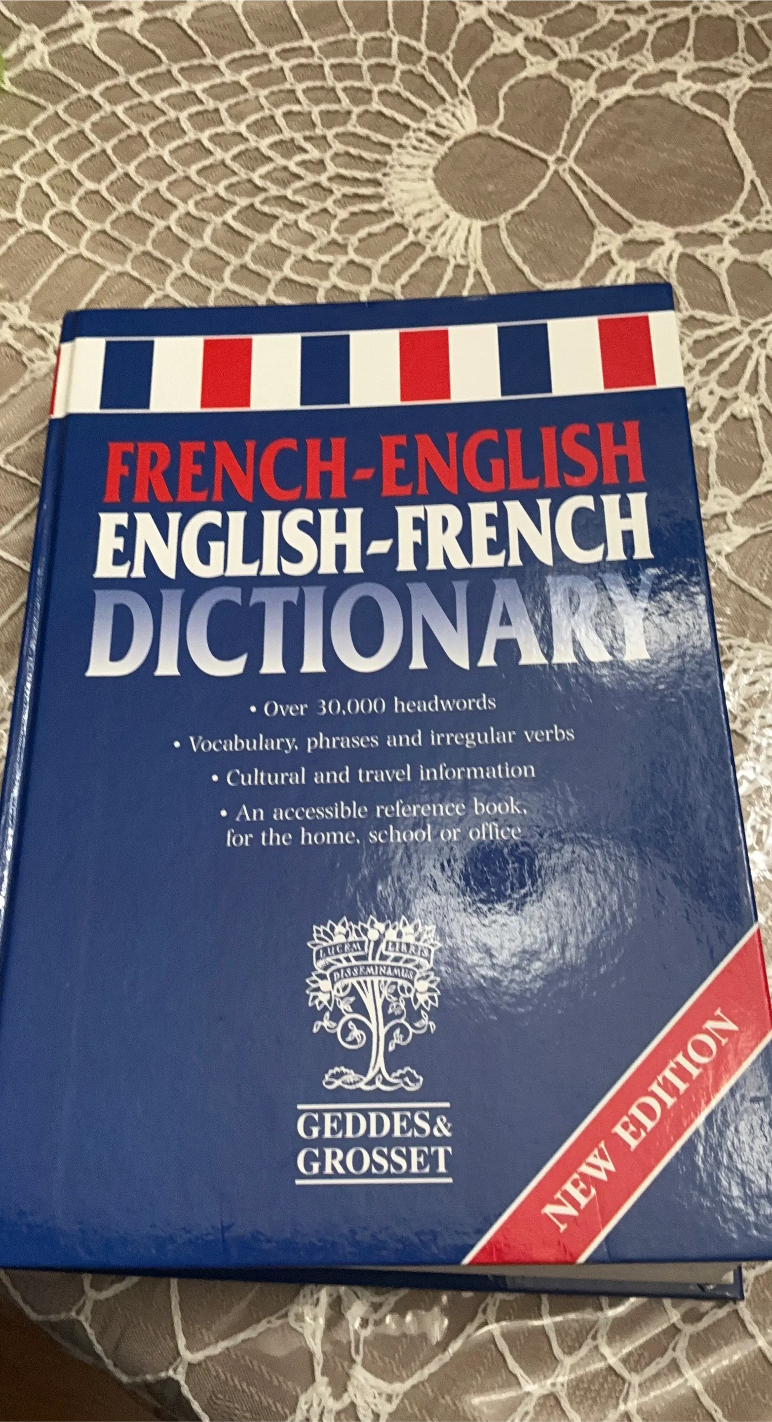 This is the "NEW EDITION" of the French-English English-French Dictionary from Geddes & Grosset. It contains over 30,000 headwords, vocabulary, phrases, and irregular verbs. It's an accessible reference book for home, school, or office.