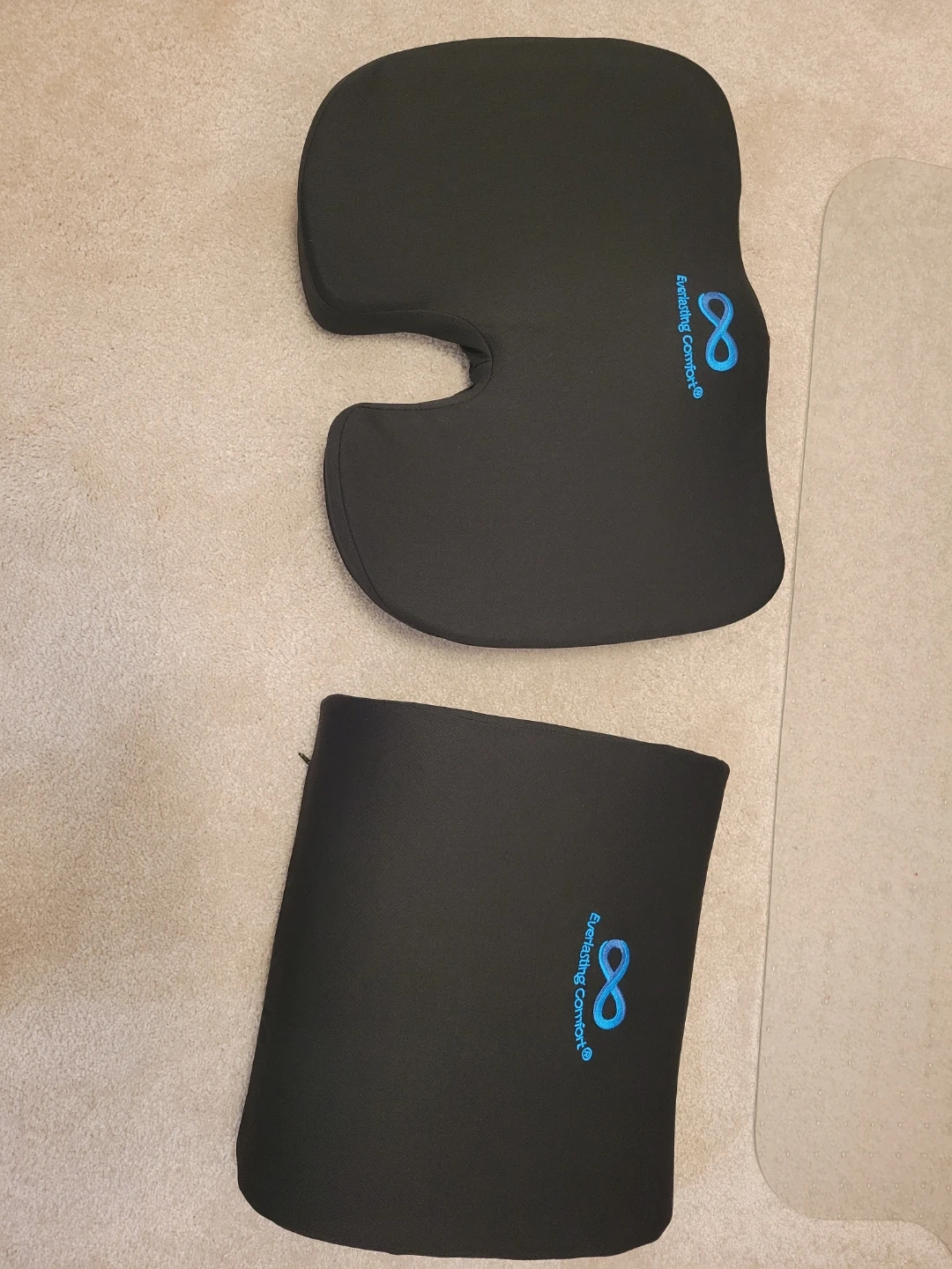 Selling an Everlasting Comfort seat cushion and lumbar support pillow set. Both are in great condition and made from a comfortable material. Perfect for adding extra support to your chair at home or in the office!
