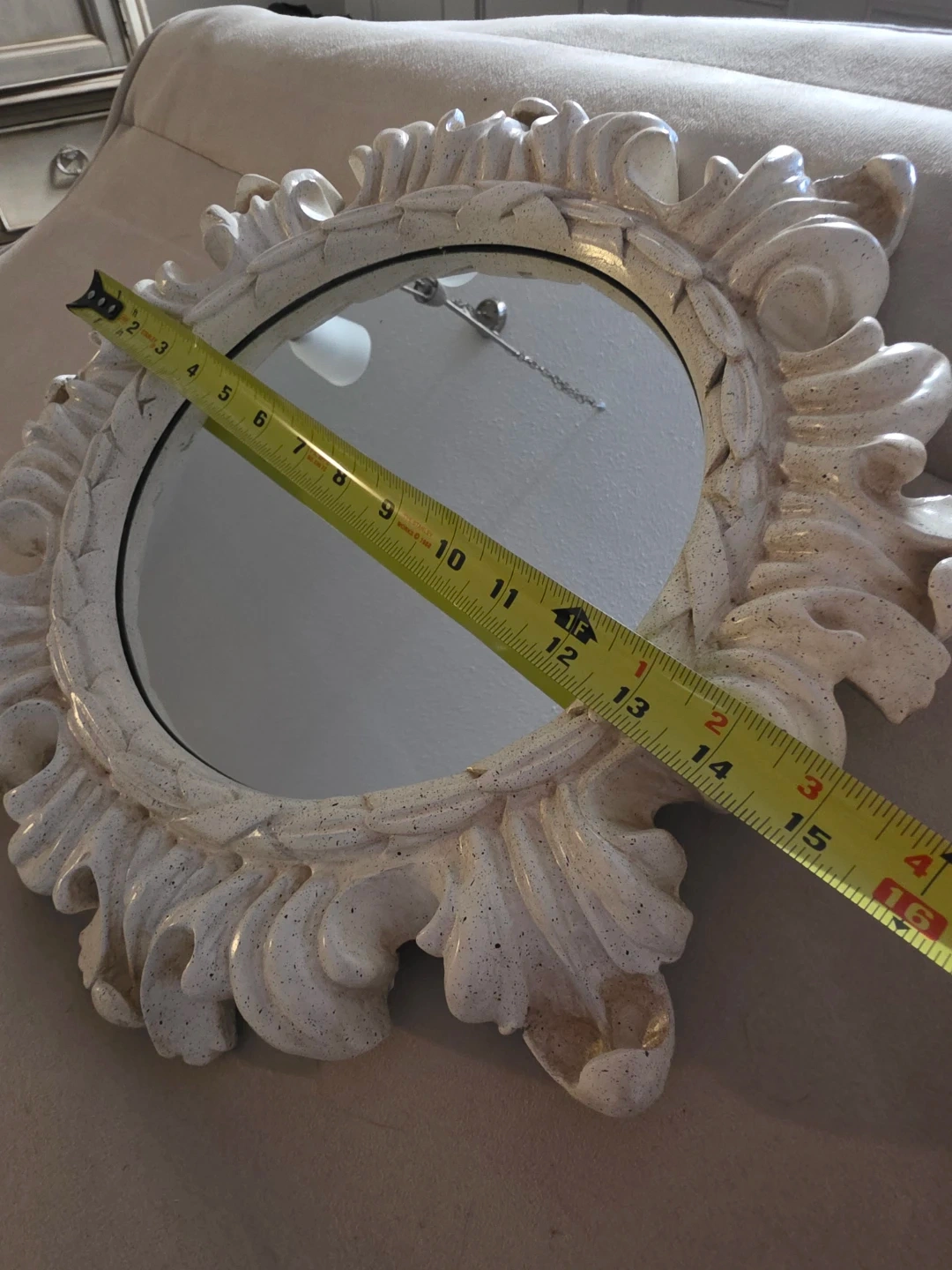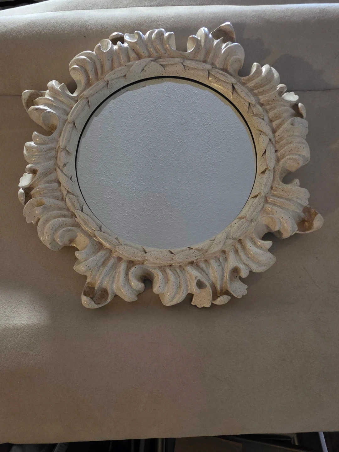 This is a decorative round wall mirror with an ornate, textured frame. The frame has a distressed off-white finish with some gold accents. It's roughly 12 inches in diameter.
