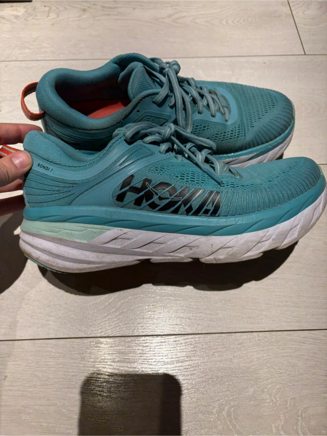 Great condition Hoka runners size 9 women or men’s 7.5. Hardly worn, I have too many shoes! Turquoise green. Hardly any wear in the tread. Pickup near Sherbourne and Adelaide St East or sometimes at some TTC stations.