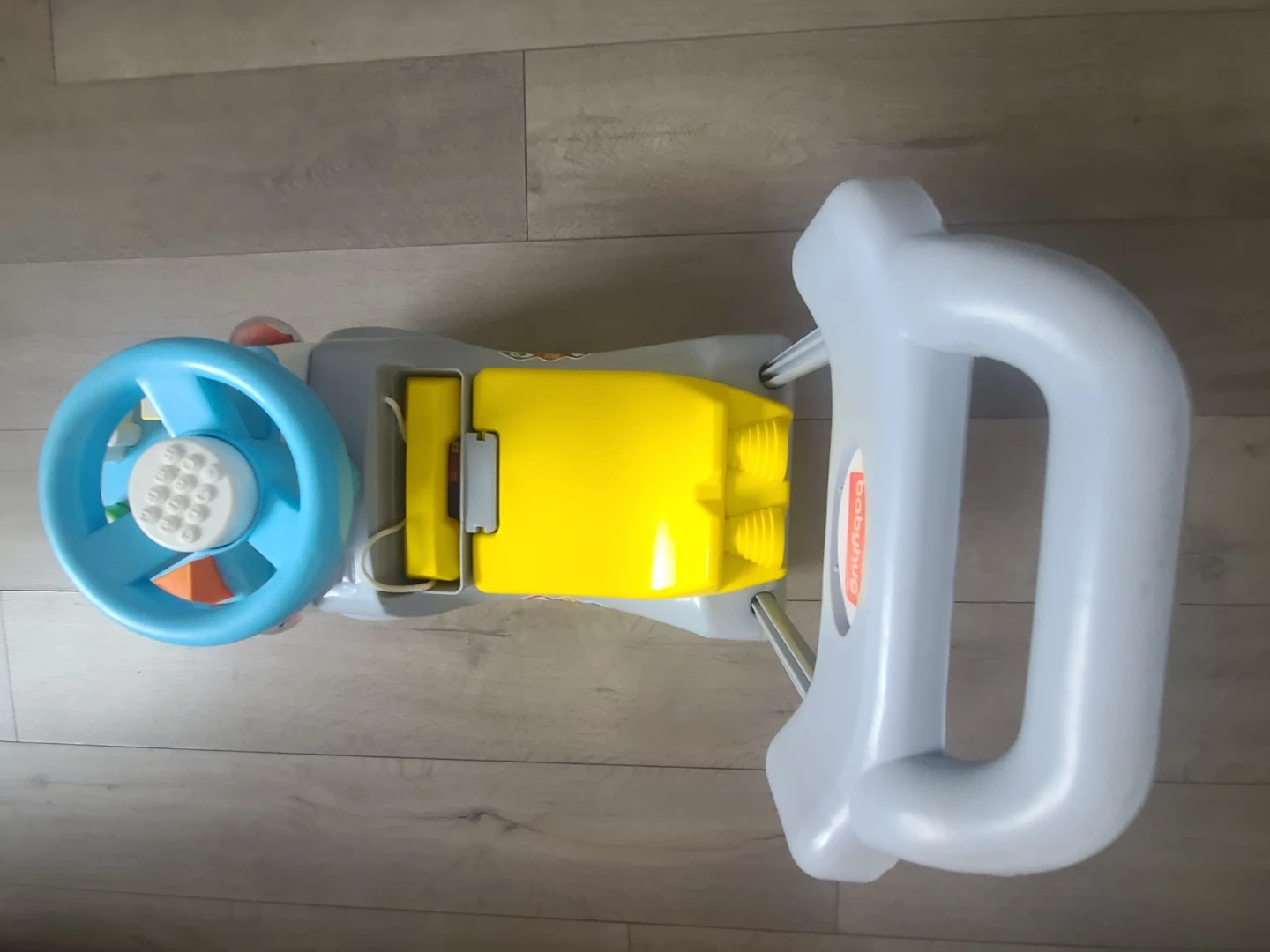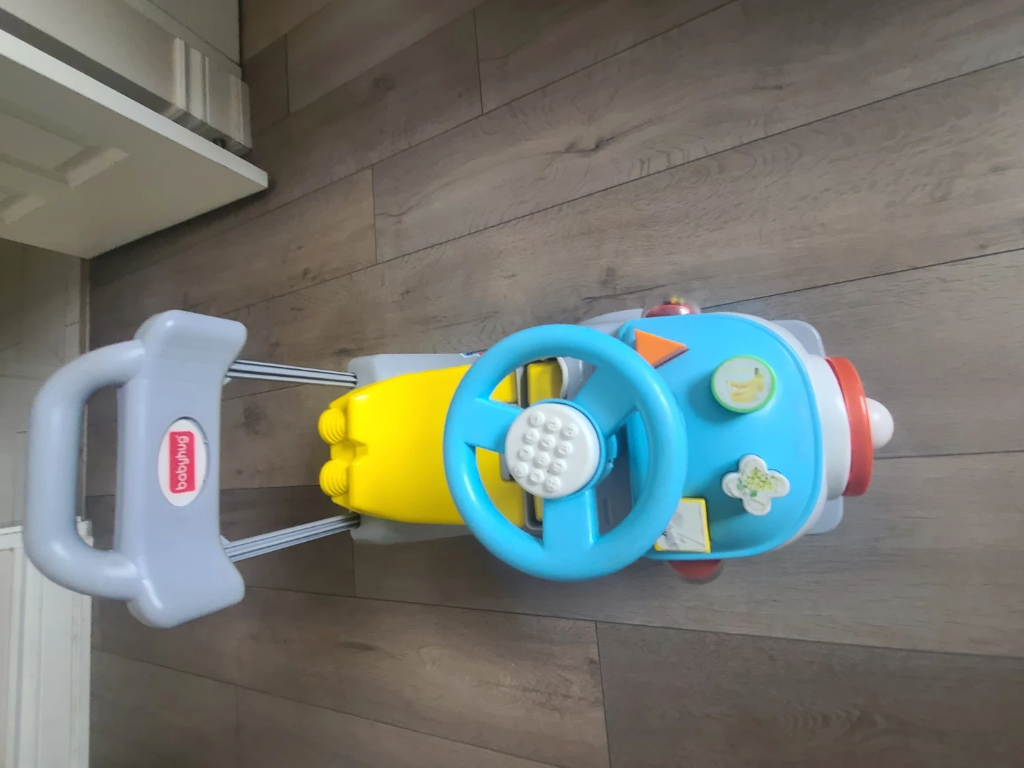 This baby activity walker features a steering wheel and colourful buttons. It's designed to entertain and engage little ones as they learn to walk. Plastic material.
