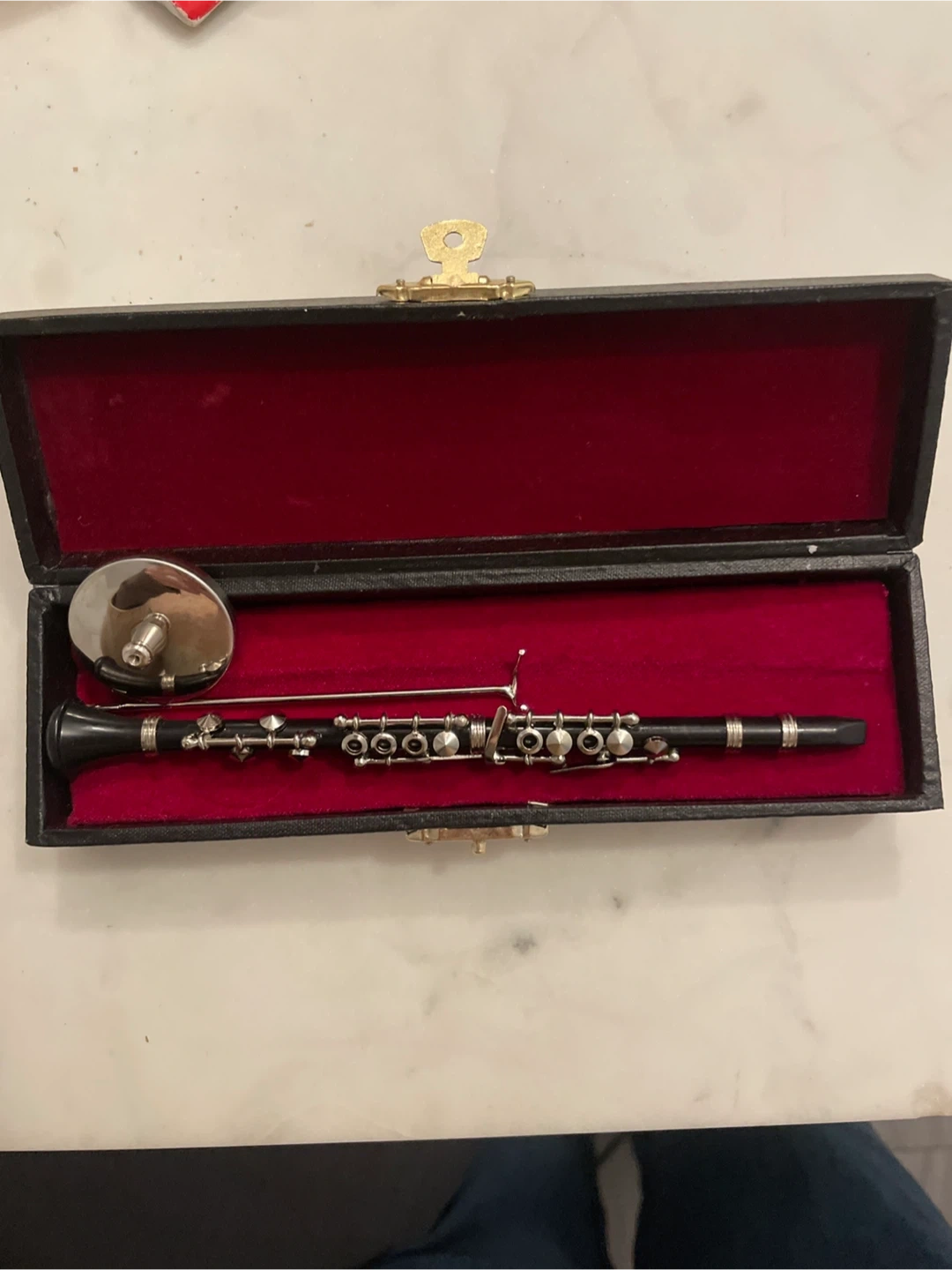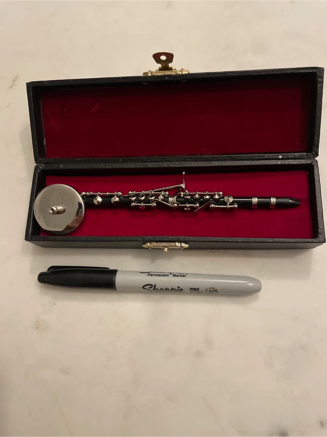 This is a decorative miniature clarinet. It comes in a black presentation case with red velvet lining. Sharpie for scale.