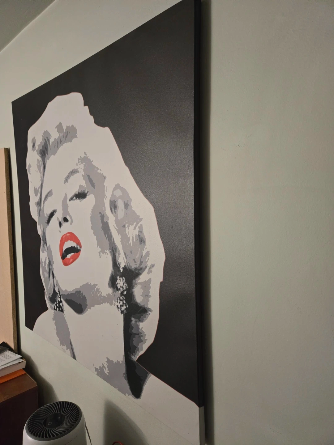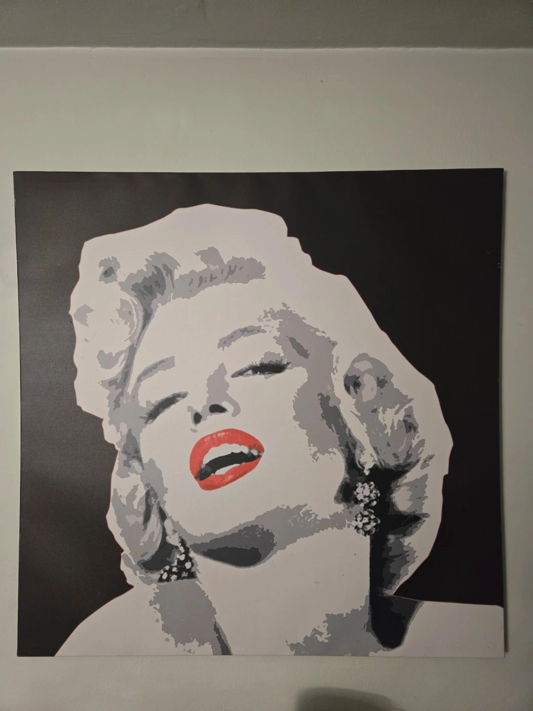 This is a bold pop art canvas print featuring Marilyn Monroe. The artwork uses a striking black, white, and grey palette with vibrant red lips and sparkling earrings. It's a great statement piece for any room!