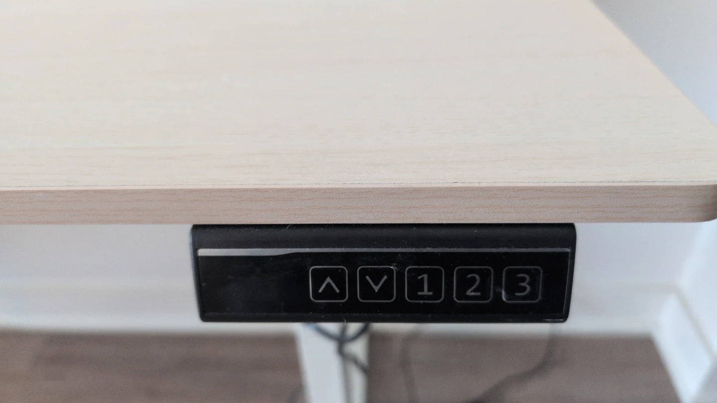 This electric standing desk features a light wood-grain top with white metal legs. It has an adjustable height control panel with memory presets for convenient use. The desk is perfect for creating an ergonomic workspace at home or in the office.