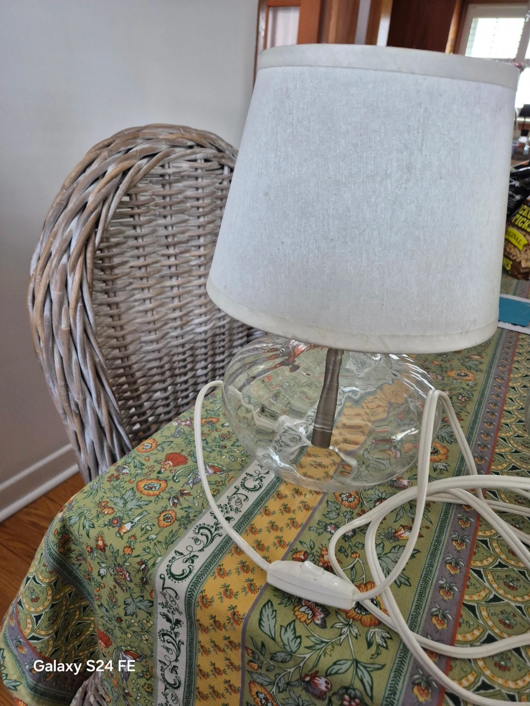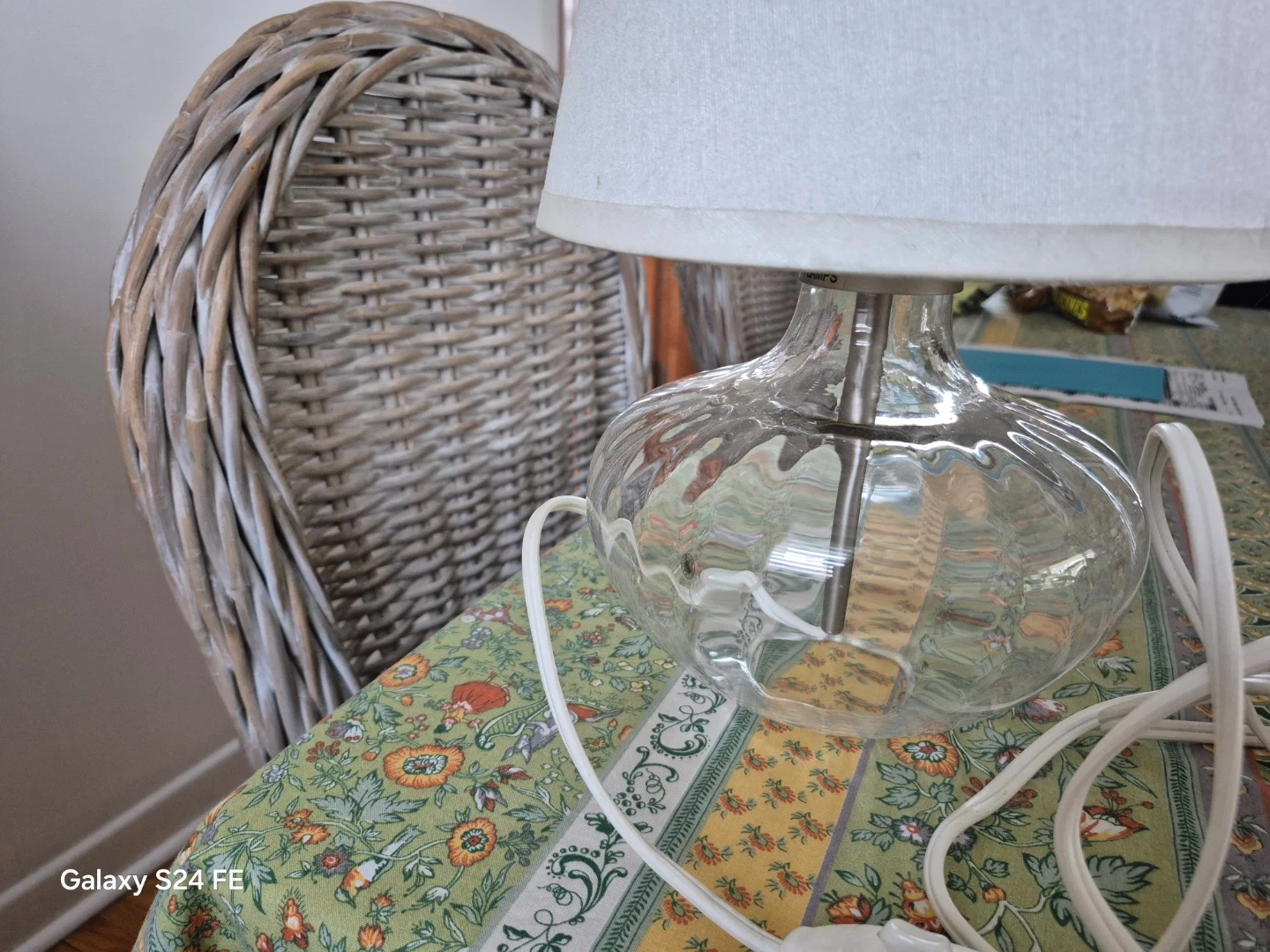 These 2 clear glass accent lamps feature a unique, textured glass base and a simple white fabric shade. It's a lovely addition to any side table or desk. Cord with inline switch included.