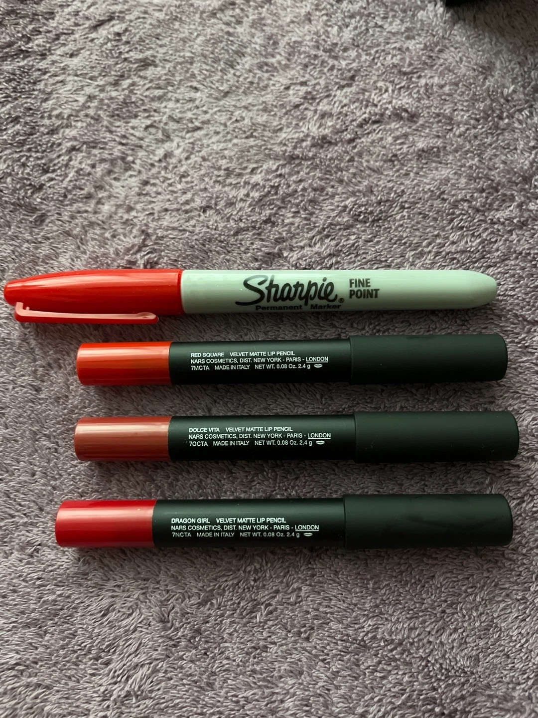 This NARS Lip Pencil Trio comes with three lip pencils. Includes original packaging. Never opened or used. Got part of a gift basket but won’t use these. Colour and length in photos. Sharpie for comparison.