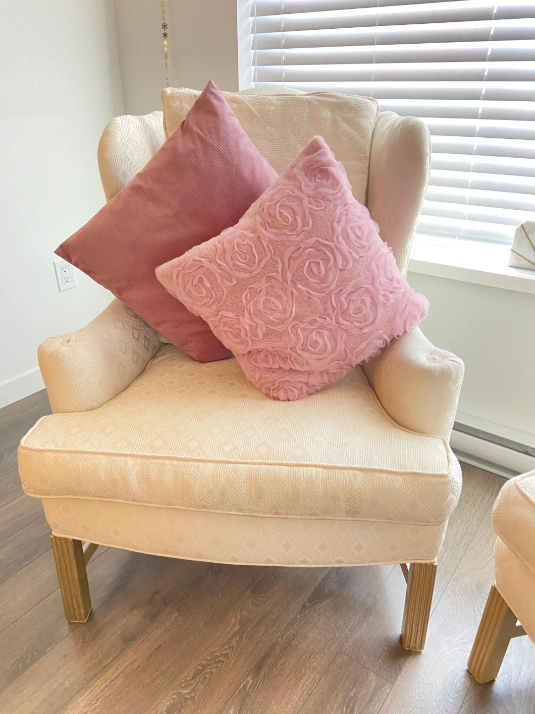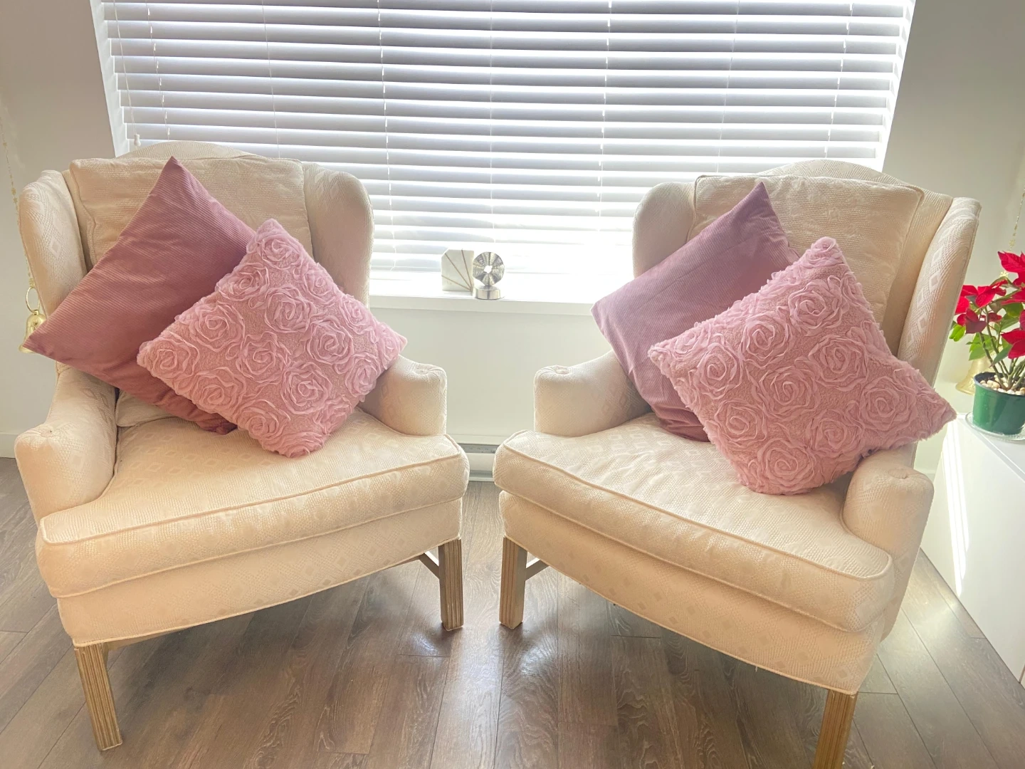 Upgrade your home decor with these stunning cream wingback chairs. The neutral tone fits any color palette, and the elegant wooden legs give them a sophisticated lift. Perfect for a cozy conversation area.