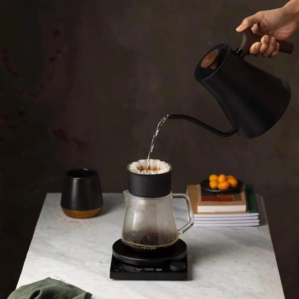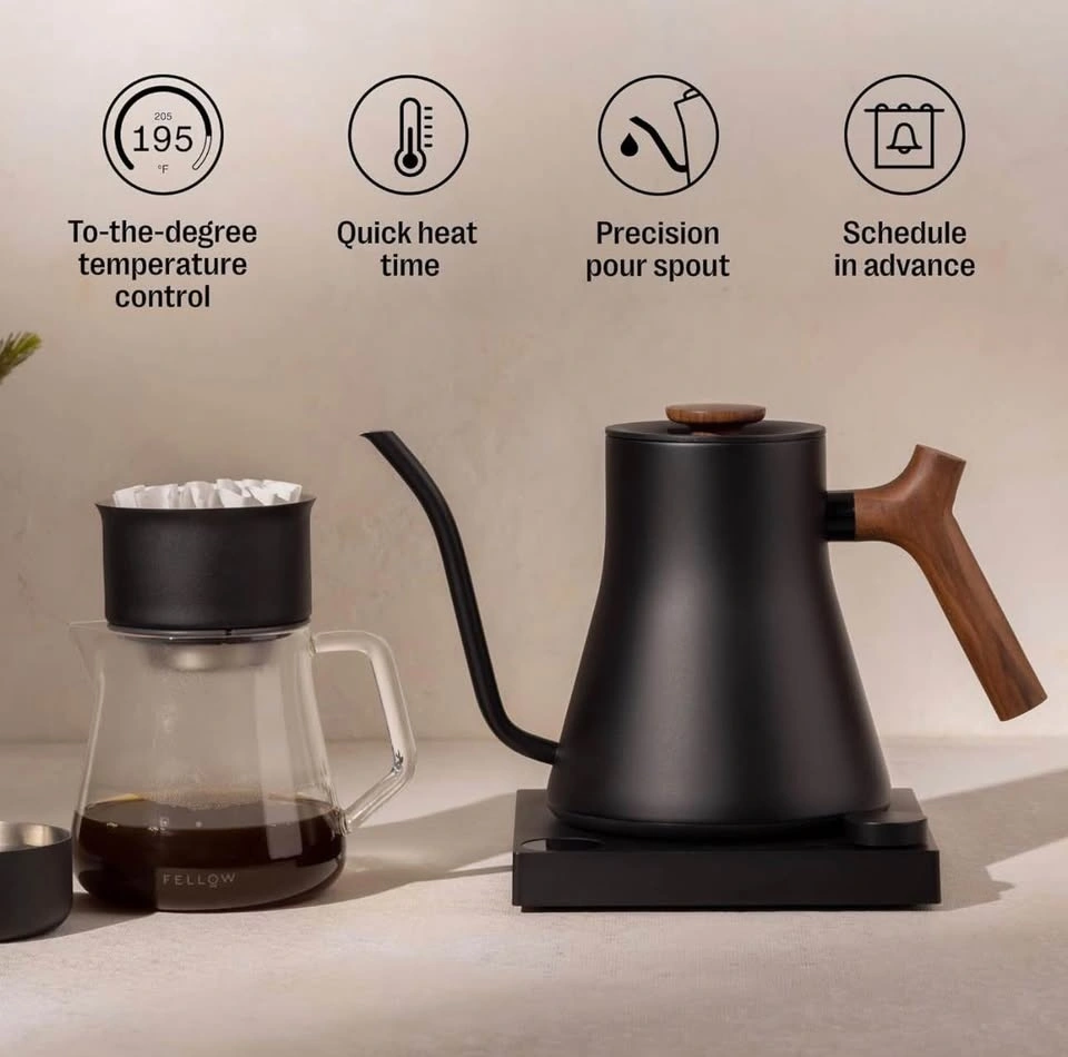 Brand new sealed Fellow Stagg EKG Pro gooseneck electric kettle. Matte black stainless steel with walnut wood handle. Quick heating with precise temperature control. Perfect for pour-over coffee and tea.