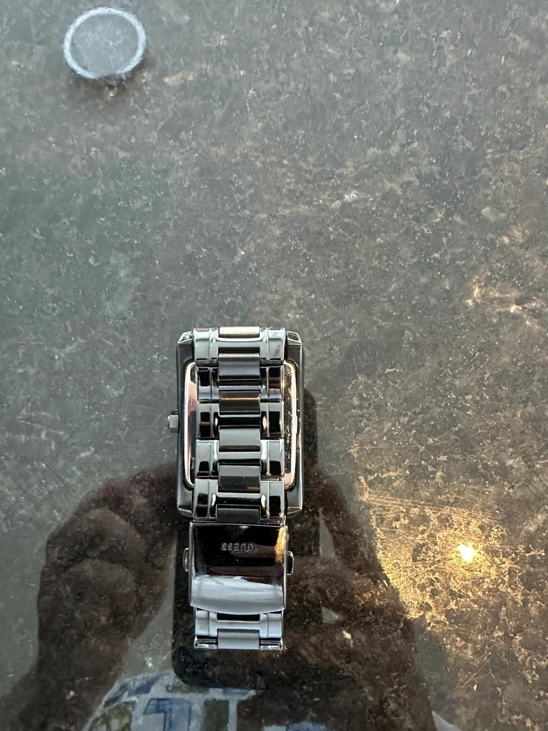 This is a GUESS unisex watch. It features a sleek, rectangular black face with a metal band. A stylish accessory for everyday wear!