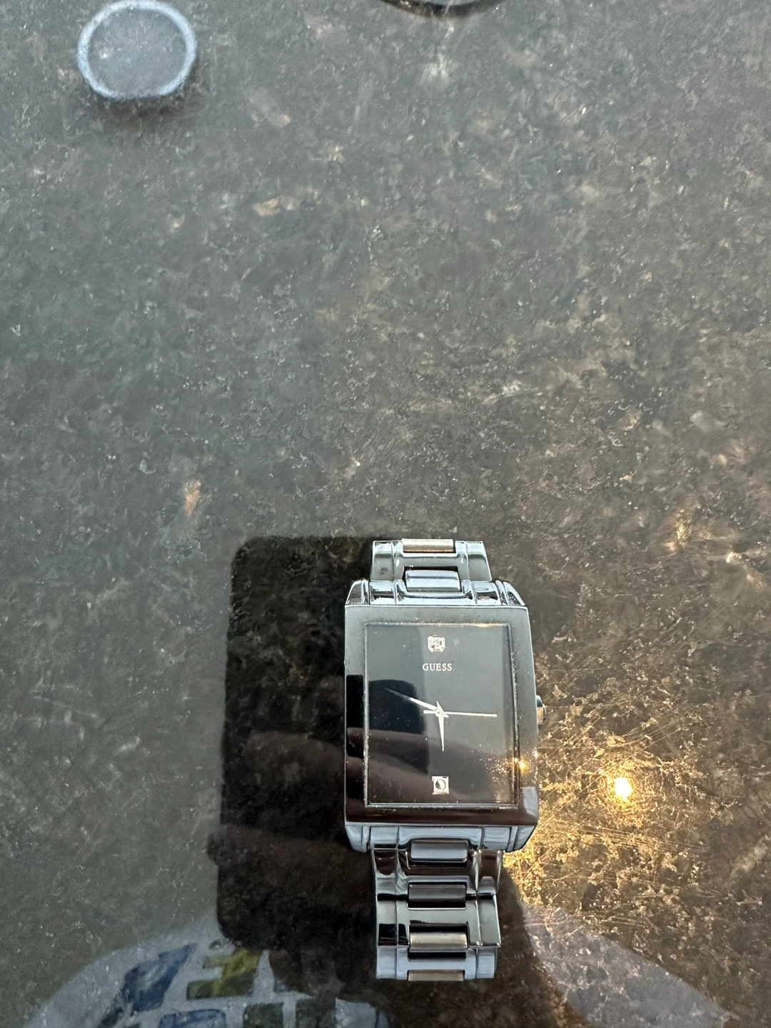 This is a GUESS unisex watch. It features a sleek, rectangular black face with a metal band. A stylish accessory for everyday wear!