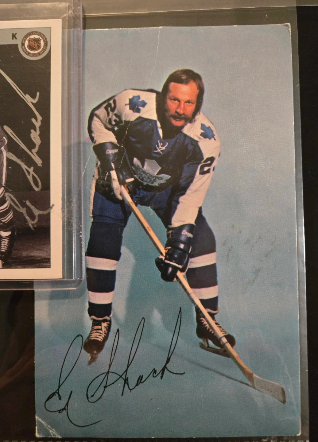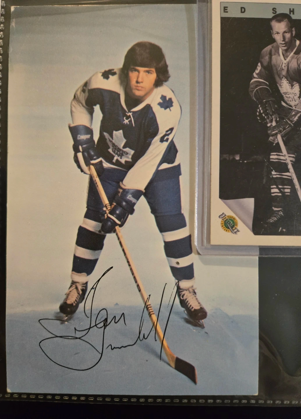 This lot includes an Official Autographed photo of Johnny Bower in net and two signed 1973 promo. photos featuring Ed Shack and Ian Turnbull. Also includes an Autographed Ed Shack Classic hockey card. These items showcase former Toronto Maple Leafs players.