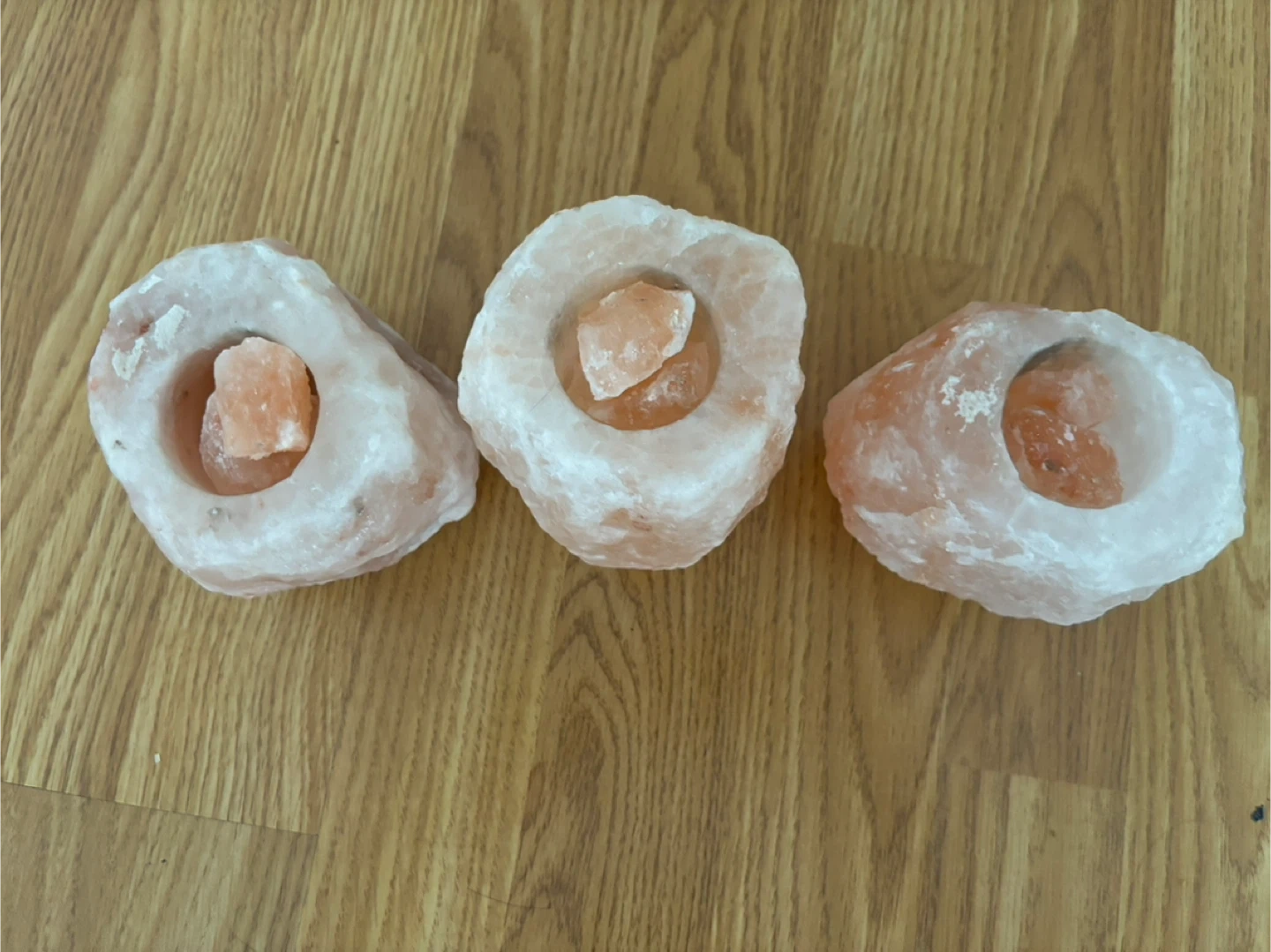 Three unique Himalayan salt tealight holders. Each piece is carved from natural salt rock, giving them an organic shape and pinkish-orange hue. They're perfect for adding a warm, ambient glow to any room. These holders are designed to fit standard tealight candles.