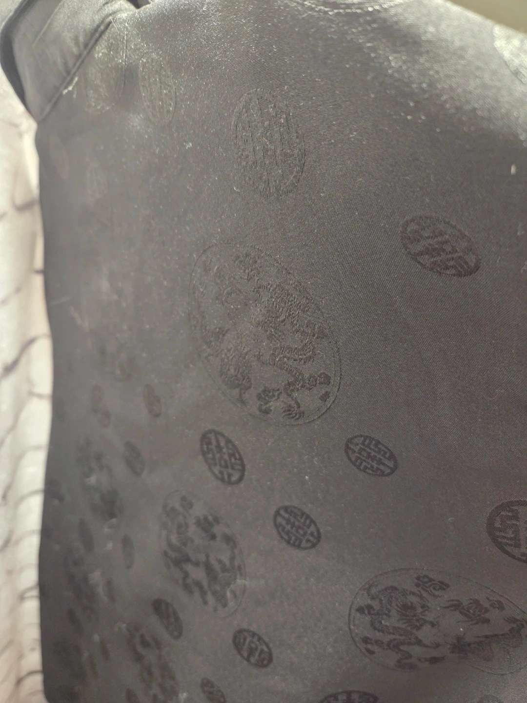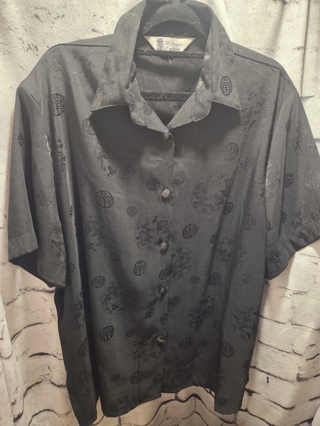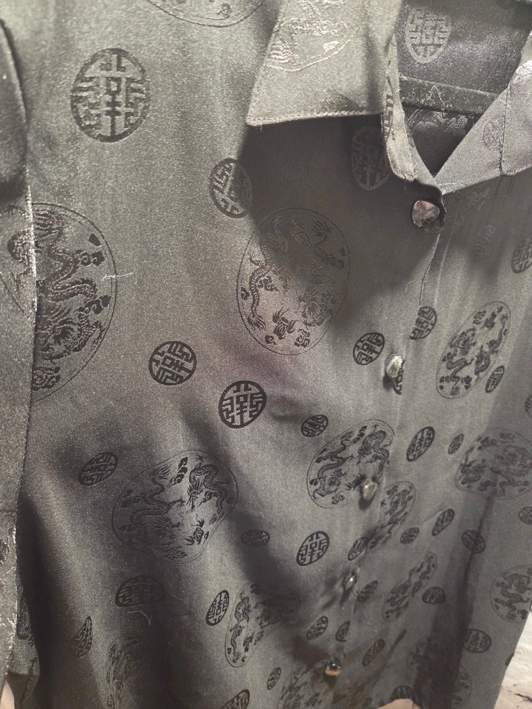 A classic black button-up shirt with an all-over dragon and Chinese symbol jacquard pattern. It has short sleeves and a collared neckline. The material has a subtle sheen. This shirt's unique print makes it a standout piece.