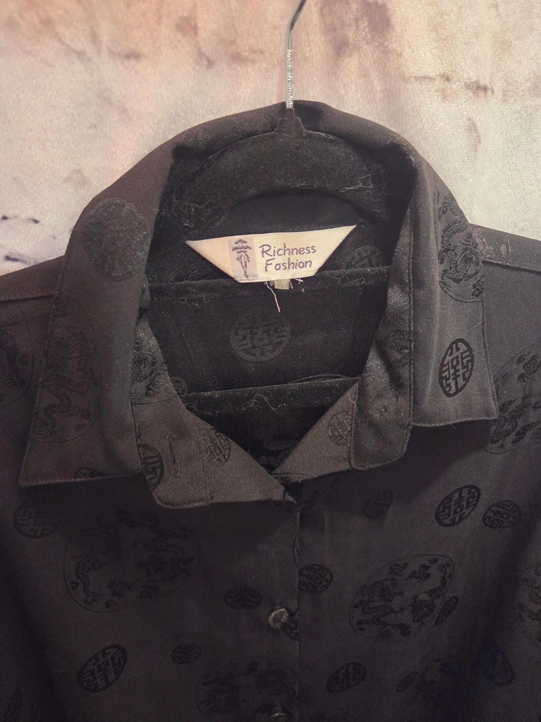 A classic black button-up shirt with an all-over dragon and Chinese symbol jacquard pattern. It has short sleeves and a collared neckline. The material has a subtle sheen. This shirt's unique print makes it a standout piece.
