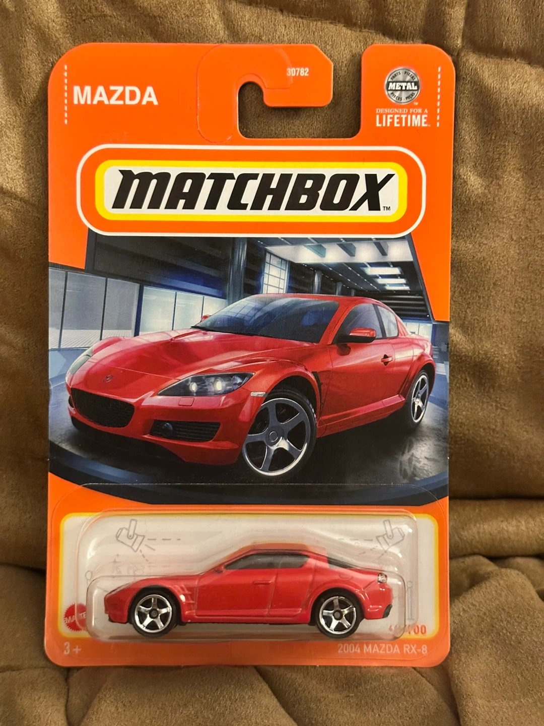 This is a Matchbox die-cast toy car featuring the 2004 Mazda RX-8. It's a detailed replica in a silver finish. Great for collectors or for kids aged 3 and up!