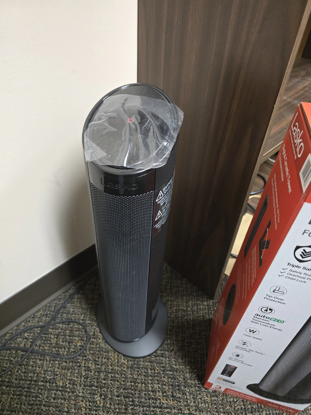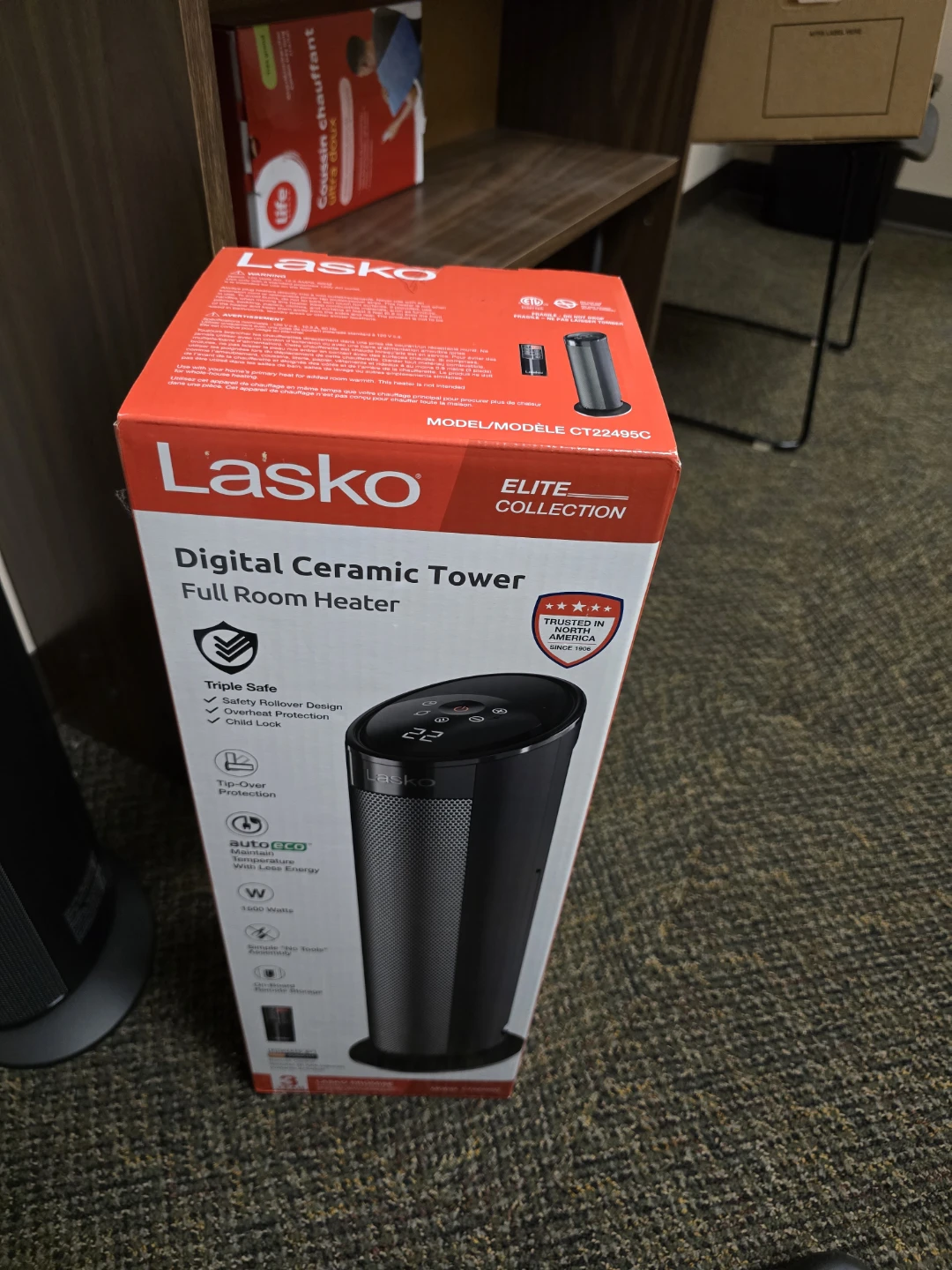I'm selling a Lasko Digital Ceramic Tower Full Room Heater. It's in great condition and comes with the original box. This heater features a triple-safe design with safety rollover protection, tip-over protection, and child lock. It also includes auto-eco technology for energy savings and operates at 1500 watts. Model number CT22495C