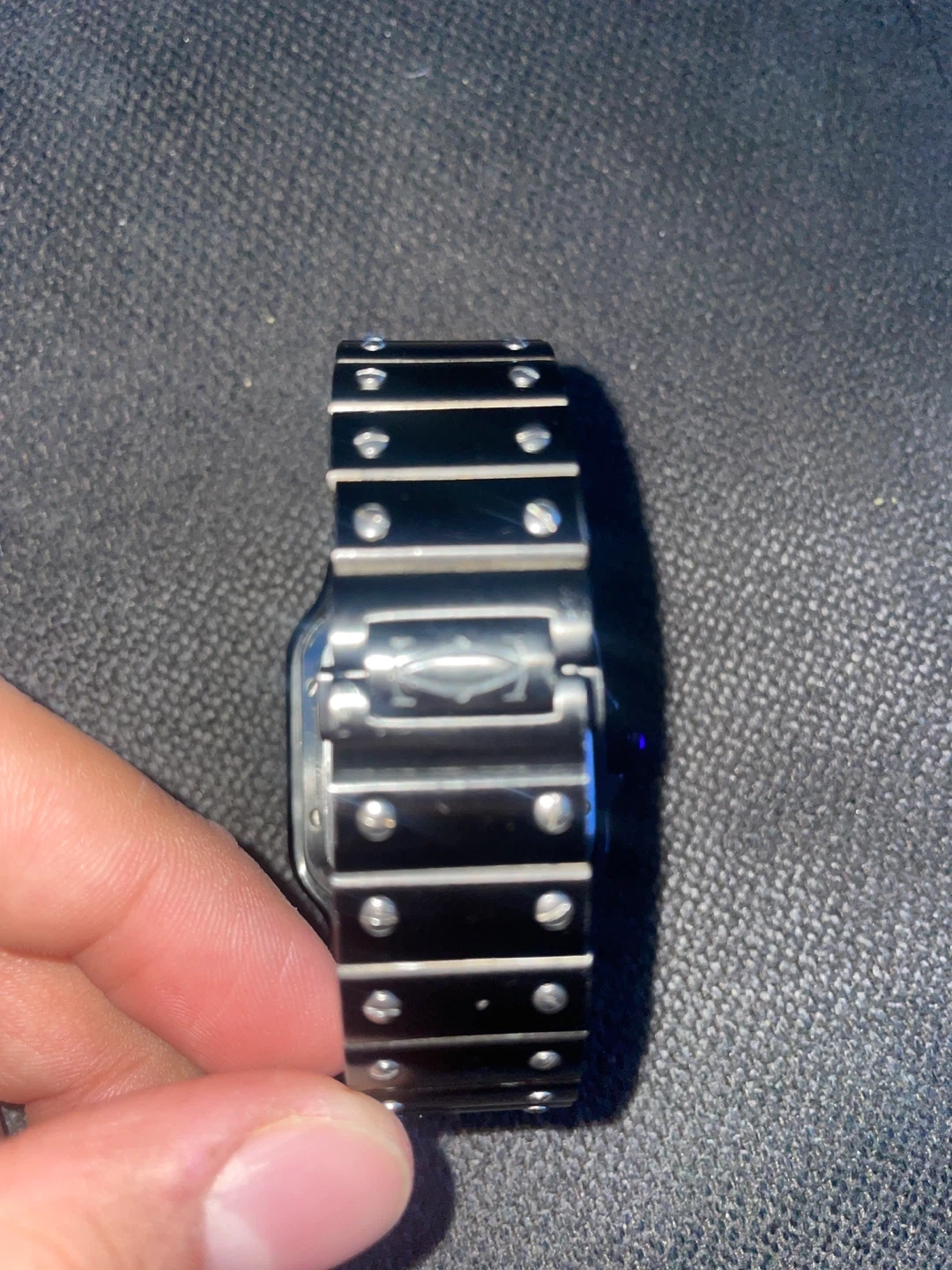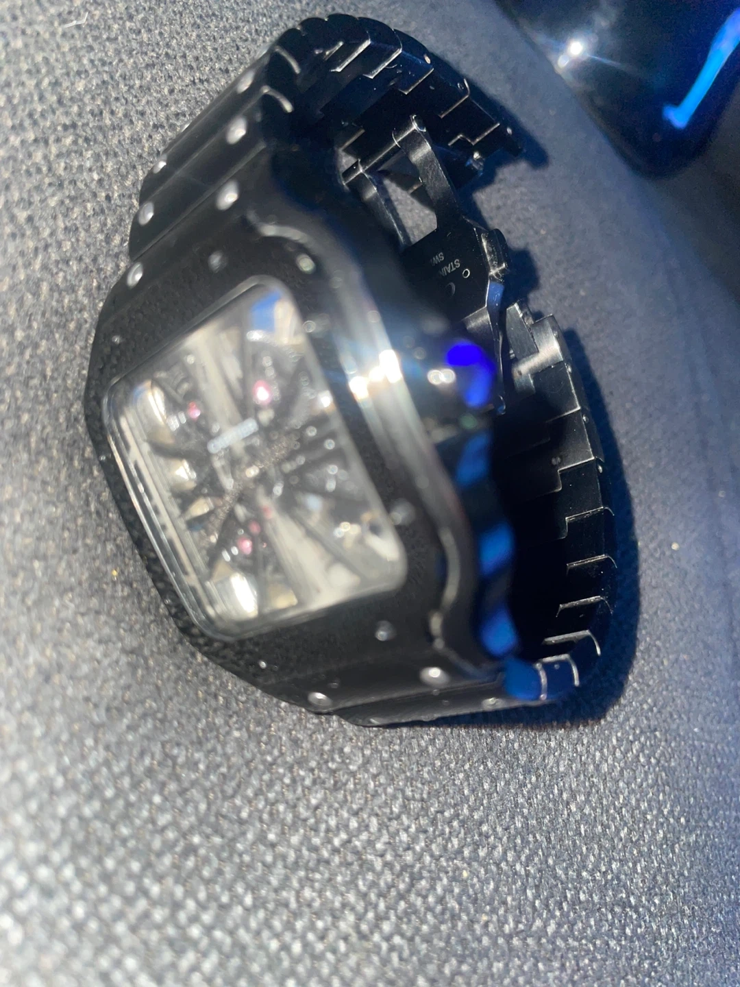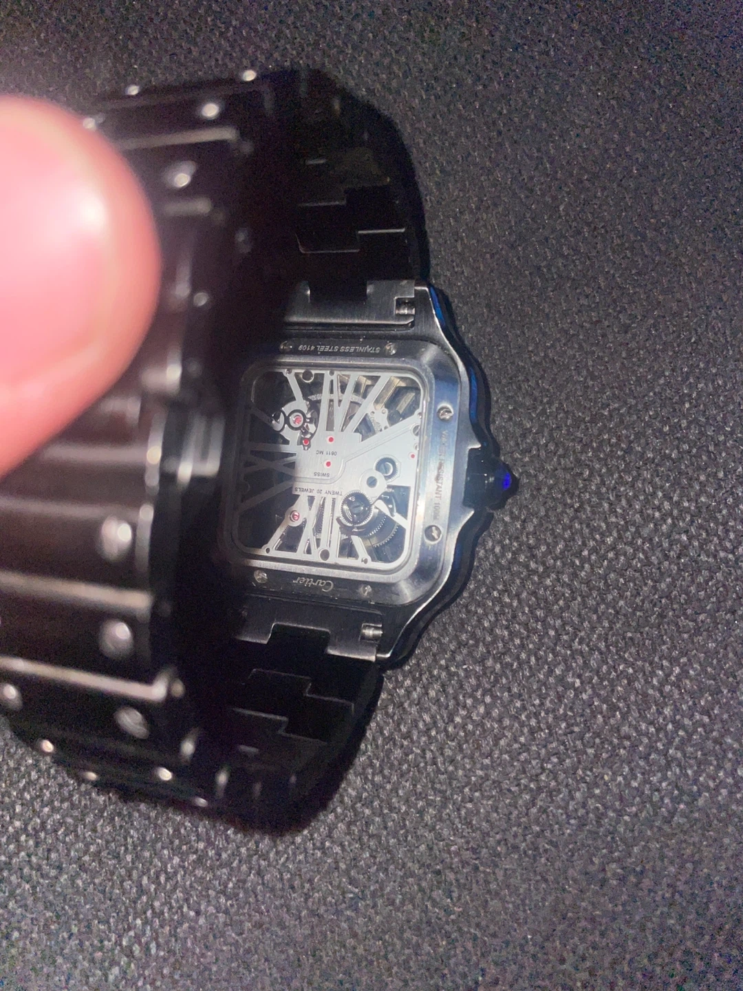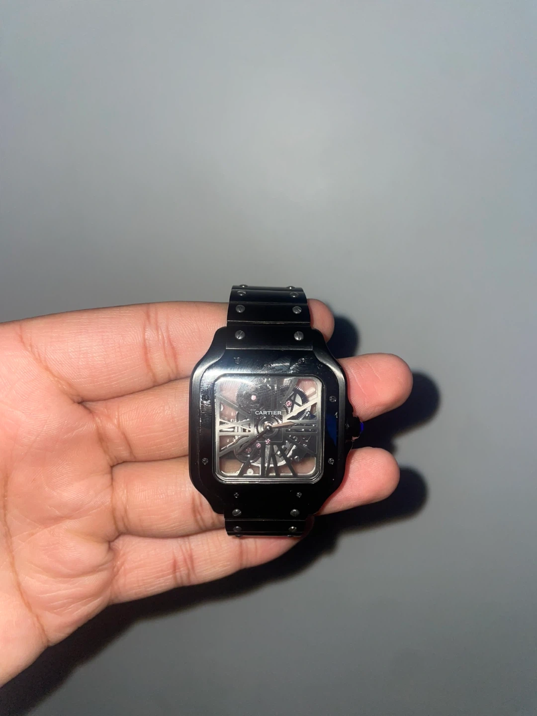 Cartier Santos Skeleton watch in black. It features an automatic movement visible through the skeletonized dial. Watch has a stainless steel case and bracelet. Selling this watch because I just don’t wear it anymore but it’s a really good watch. feel free to ask any questions before buying it