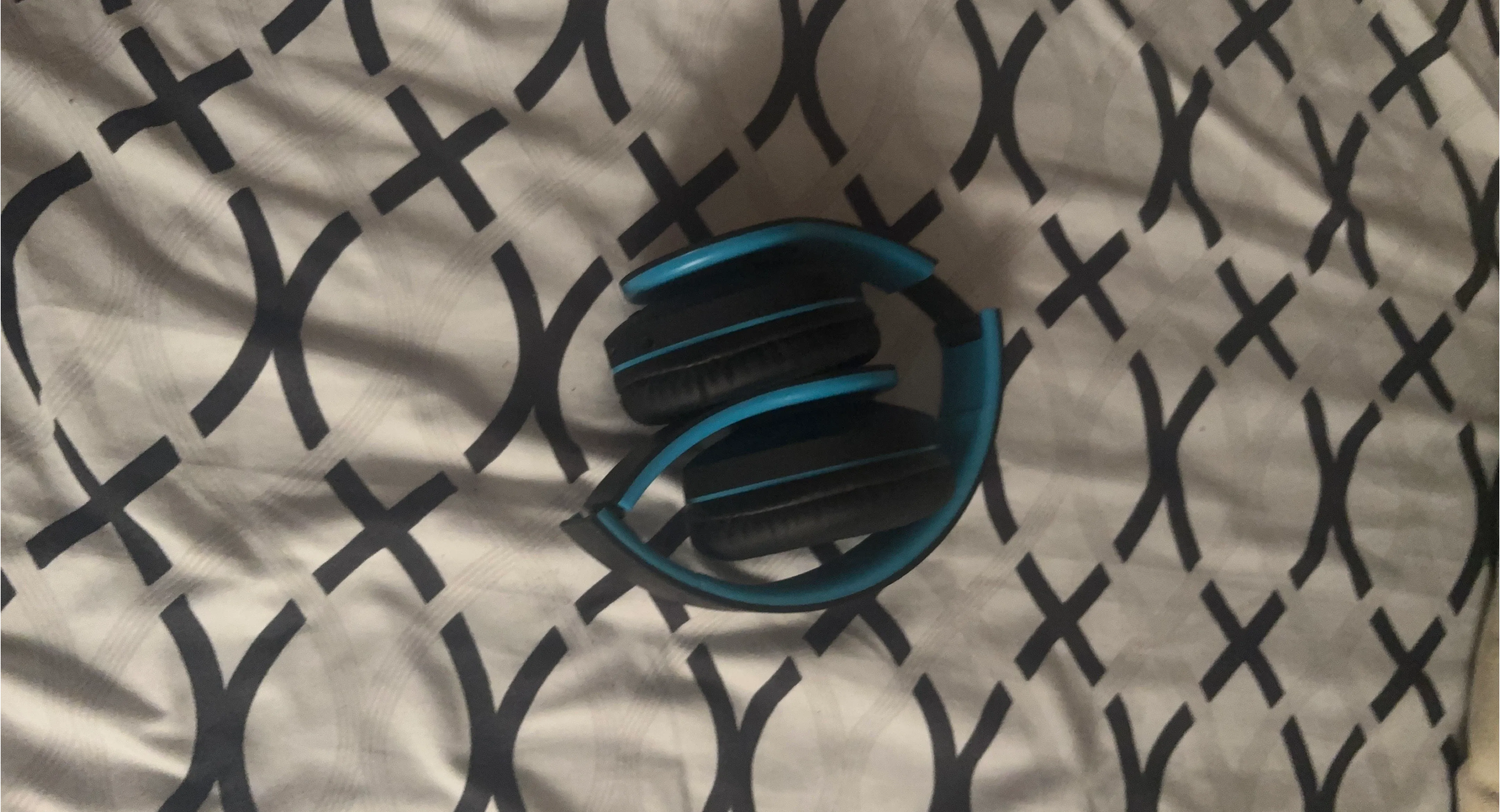 These are folding over-ear headphones with black earcups and blue accents. The earcups are padded for comfort. They're great for listening to music or podcasts.