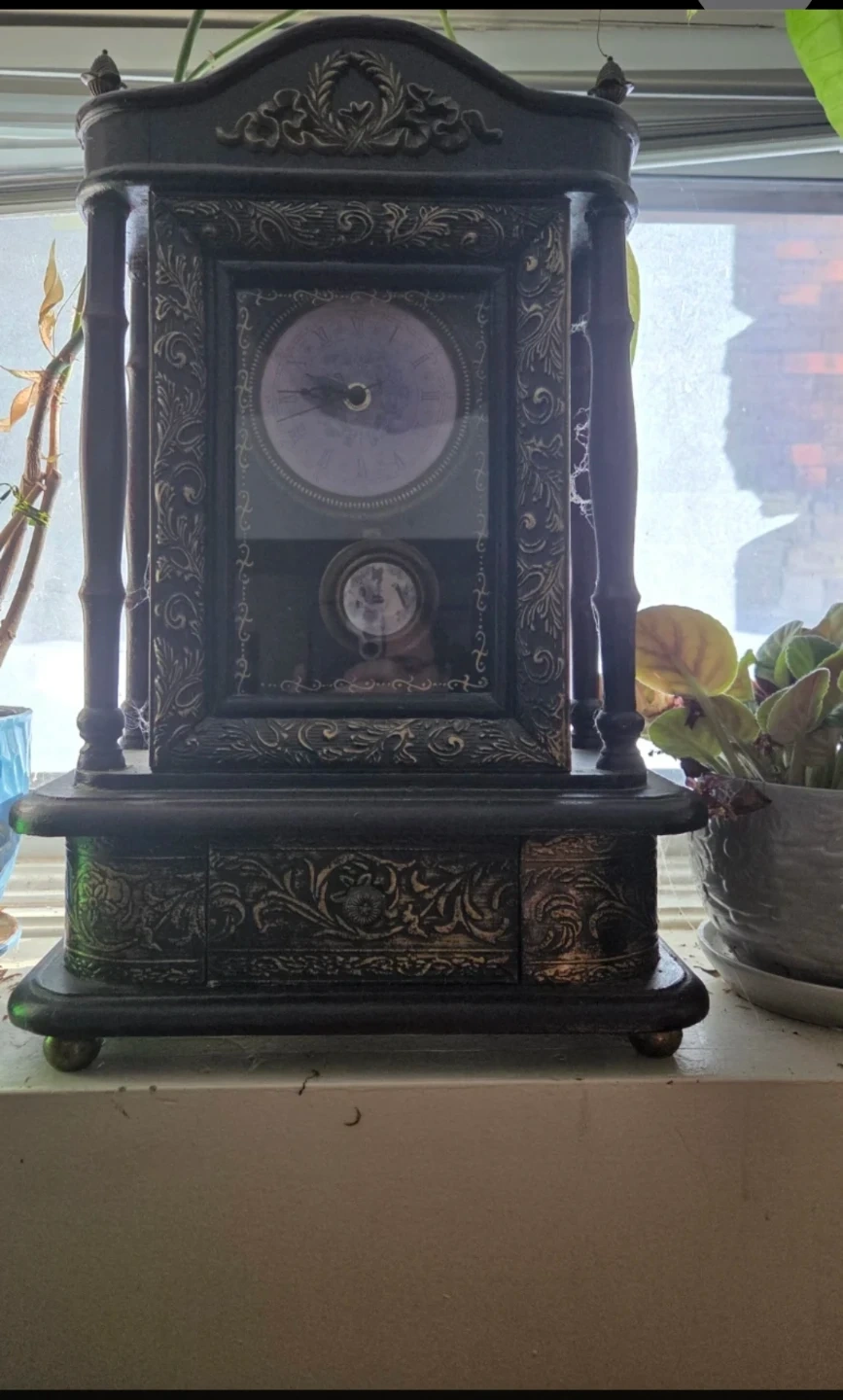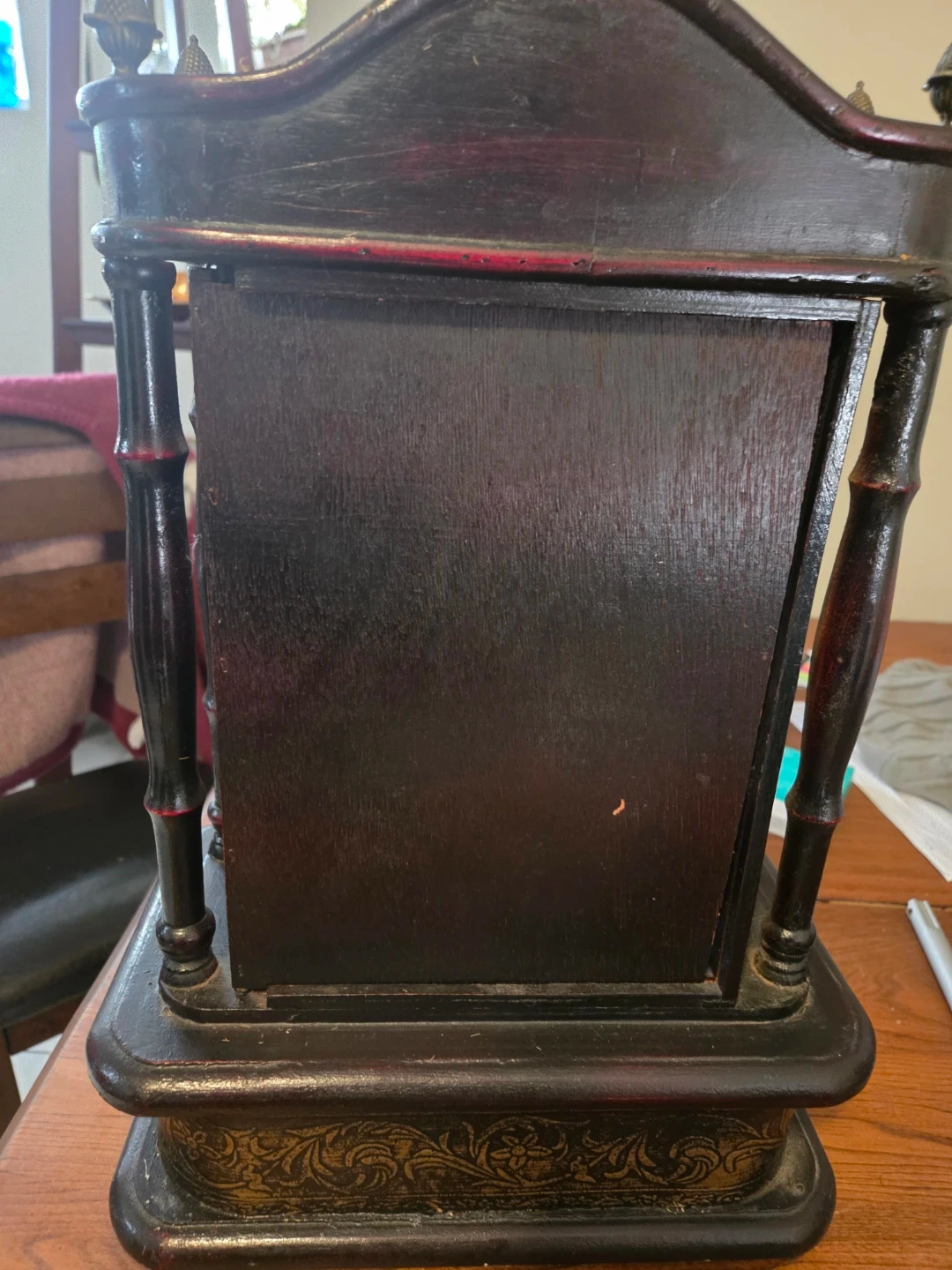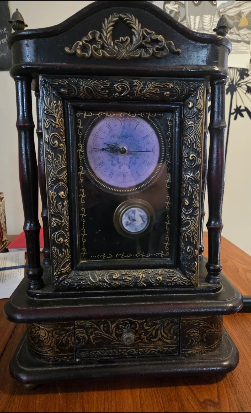 Contains a working pendulum, built-in storage drawer in base. And yes, it does make the classic ticking sound.