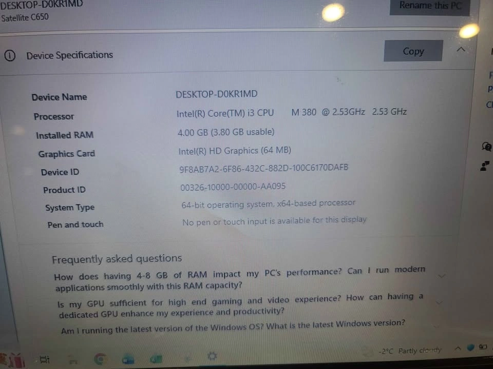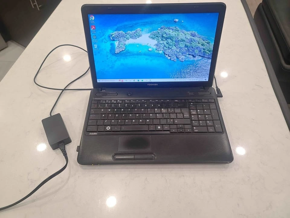 Selling Toshiba Satellite laptop in working condition. ✔️ Intel Core i3 (2.53GHz) ✔️ 4GB RAM ✔️ 466GB storage ✔️ Windows installed ✔️ Charger included ⚠️ Battery does NOT work – must stay plugged in. ⚠️ One side of the laptop casing is slightly damaged (see pictures). Does not affect performance. Good for basic use like browsing, YouTube, school work, and documents. Older model but works fine when plugged in.