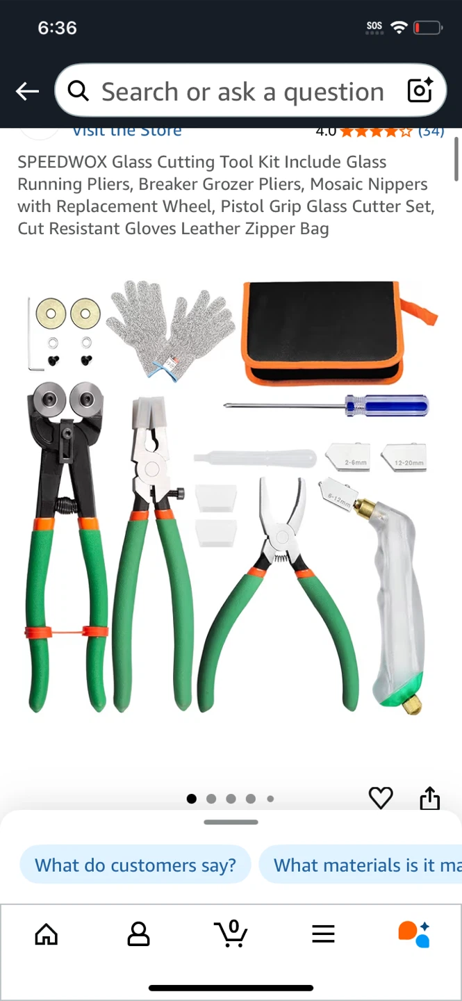 Selling a SPEEDWOX glass cutting tool kit. It includes running pliers, breaker grozer pliers, mosaic nippers with replacement wheel, pistol grip glass cutter set, cut resistant gloves and a leather zipper bag