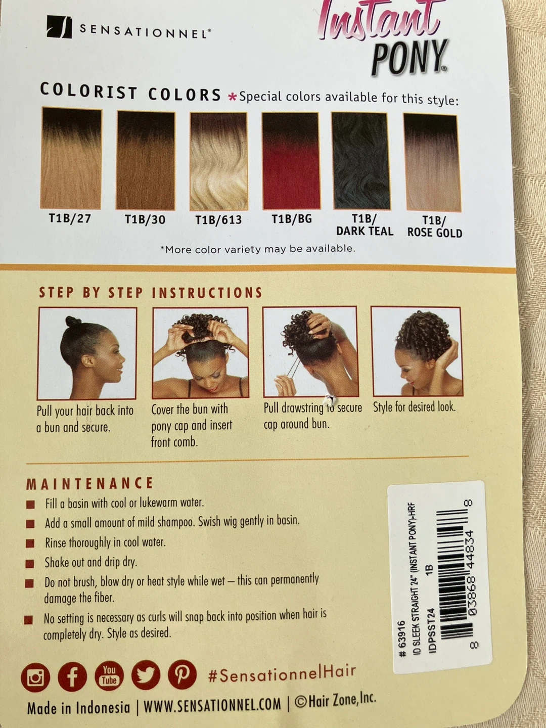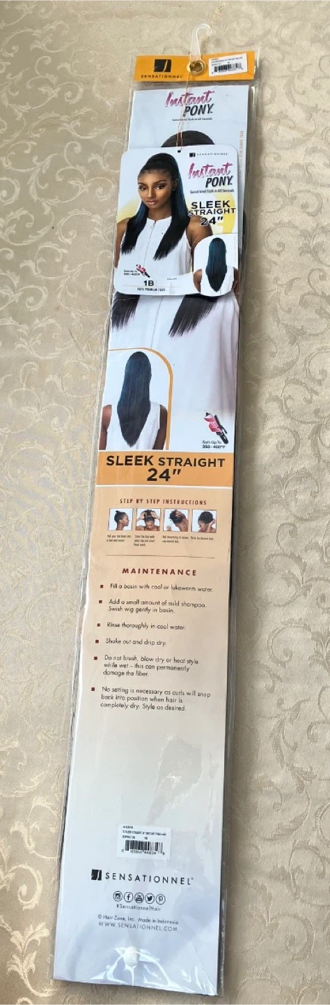 Sensationnel Instant Pony Sleek Straight hair extension. This is 24 inches long and made with 100% premium fiber. It's safe up to 350-400 degrees Fahrenheit. Perfect for a quick and easy style change!