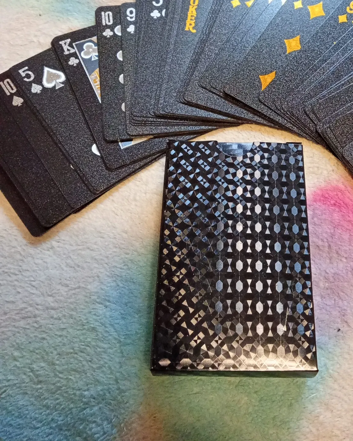 A deck of black playing cards with a striking geometric patterned case. They're standard size for easy handling. Perfect for poker nights or magic tricks!
