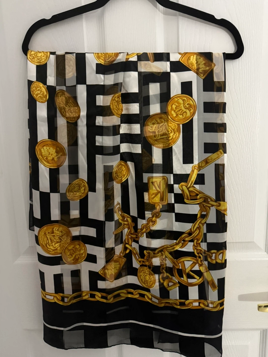 *Like New* This beautiful, designer inspired scarf features a black and white checkerboard pattern with gold coin and chain motifs. It's made of a lightweight polyester material, perfect for adding a touch of flair to any outfit.