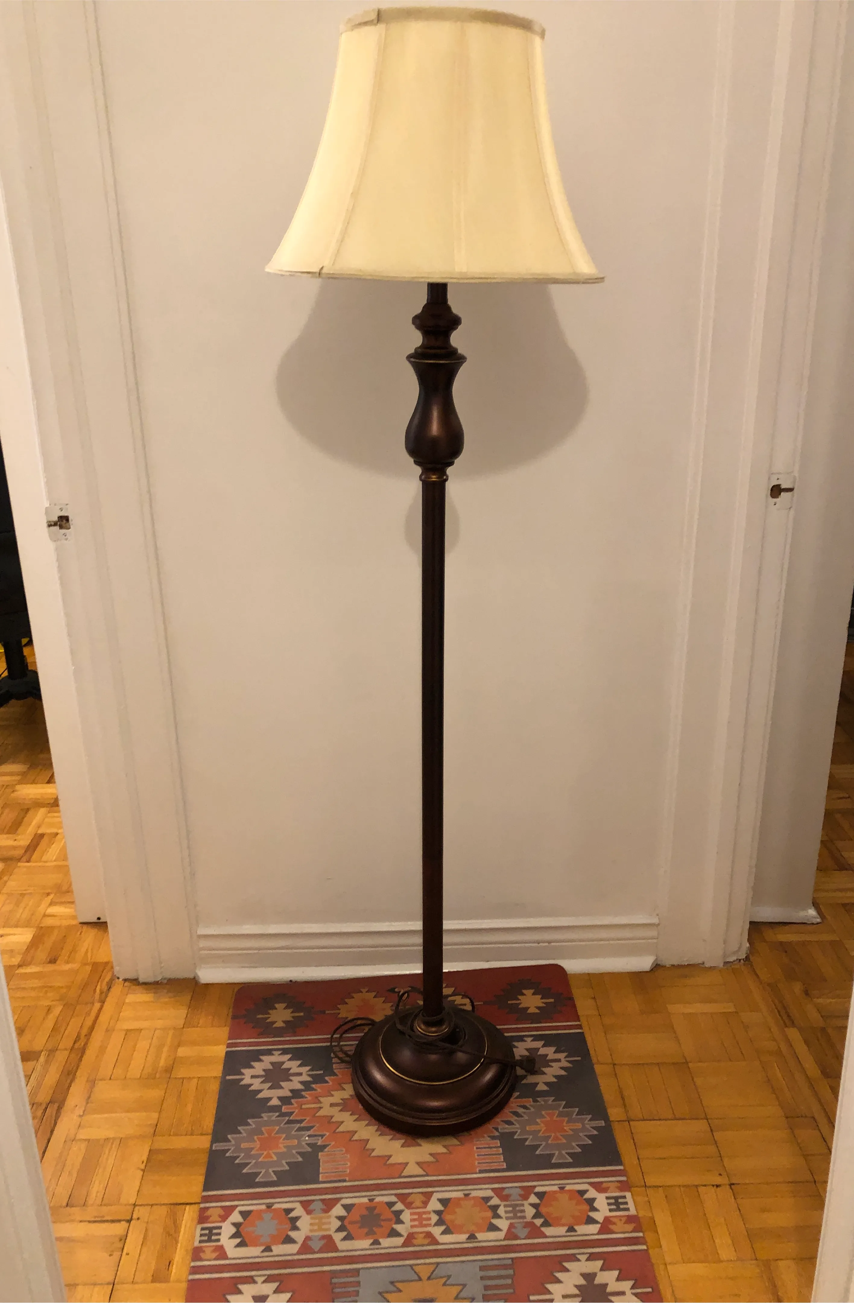 Selling a metal floor lamp with a classic beige shade. It has a dark brown base and stands tall, providing a nice ambient light. Perfect for adding a touch of elegance to any room!