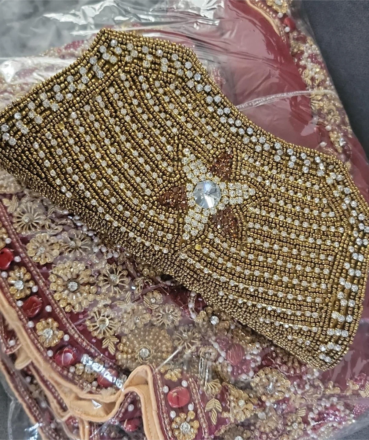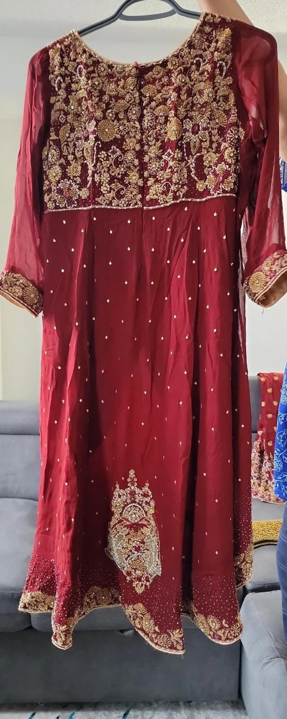 Beautifully detailed red Pakistani dress with intricate gold embroidery. It comes with a matching embellished clutch. Perfect for special occasions and celebrations!