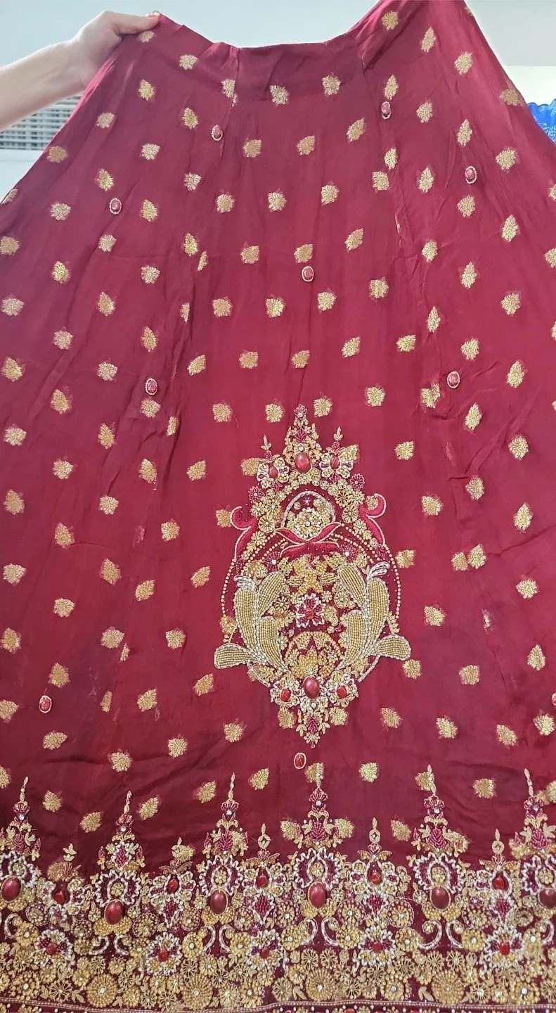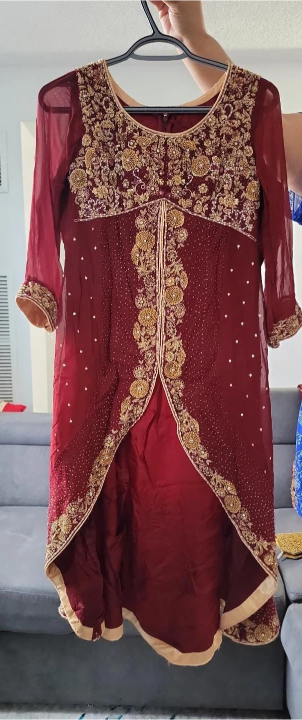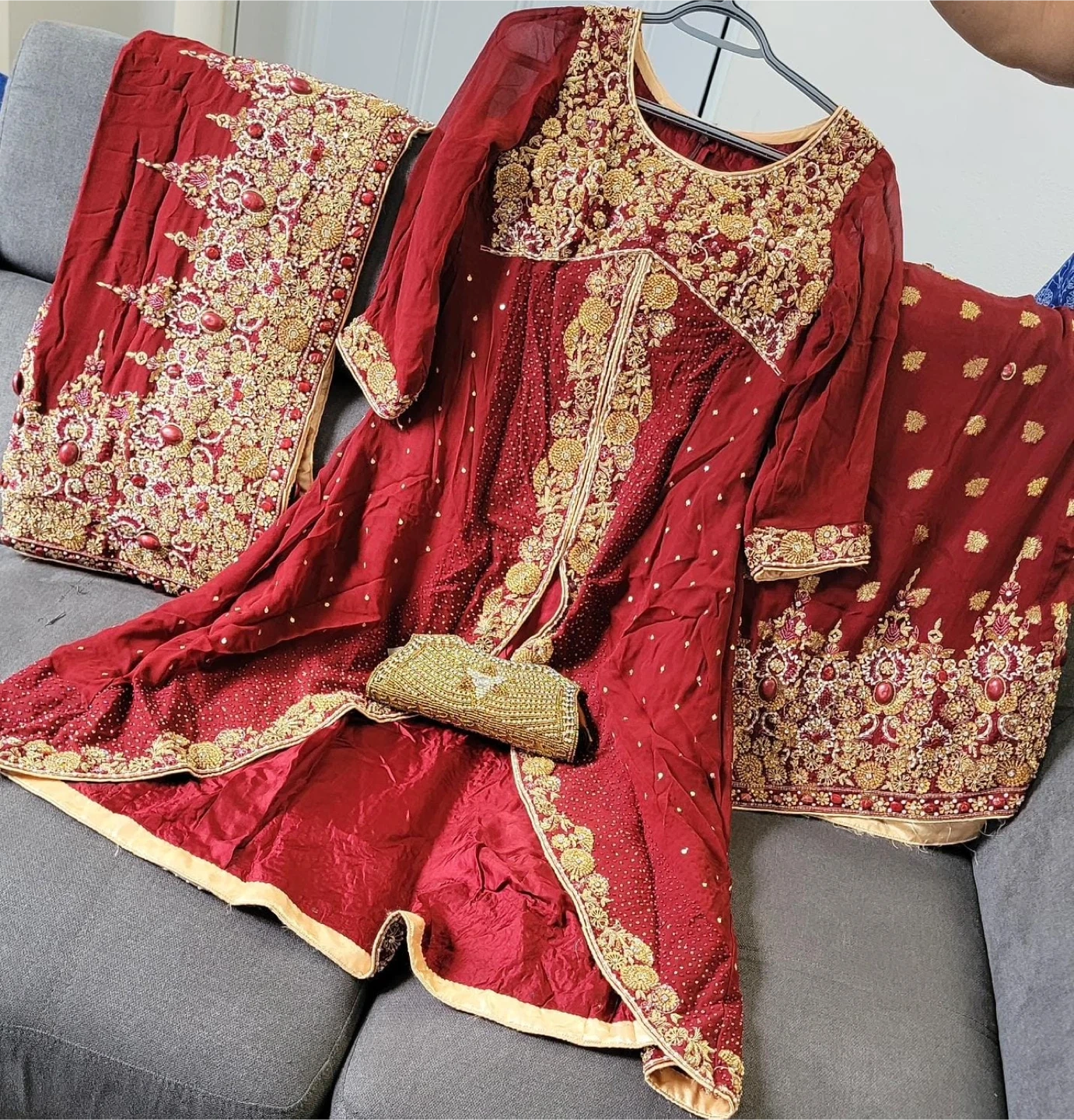 Beautifully detailed red Pakistani dress with intricate gold embroidery. It comes with a matching embellished clutch. Perfect for special occasions and celebrations!