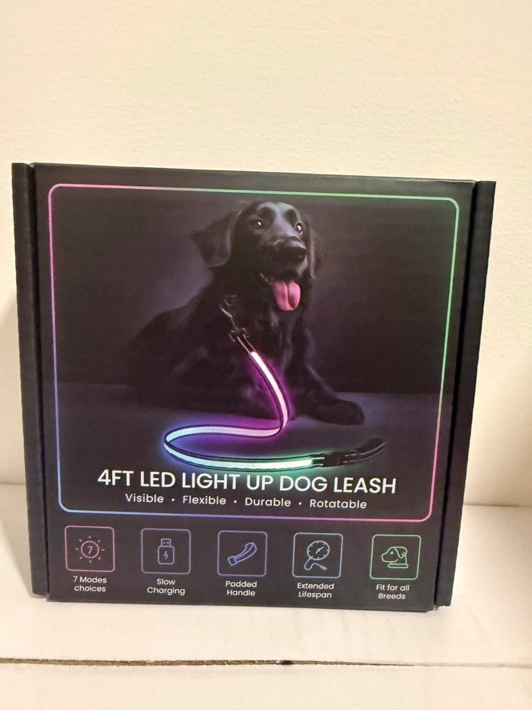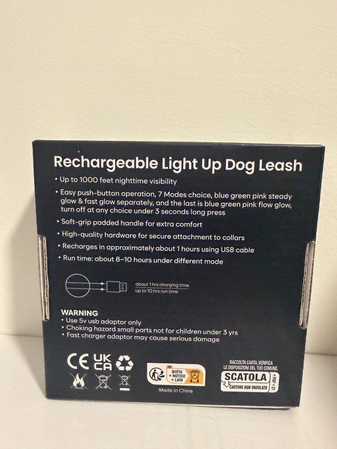 Rechargeable light up dog leash with 7 Modes choice. Easy push-button operation and a soft-grip padded handle for extra comfort. Runs for about 8-10 hours on a full charge.