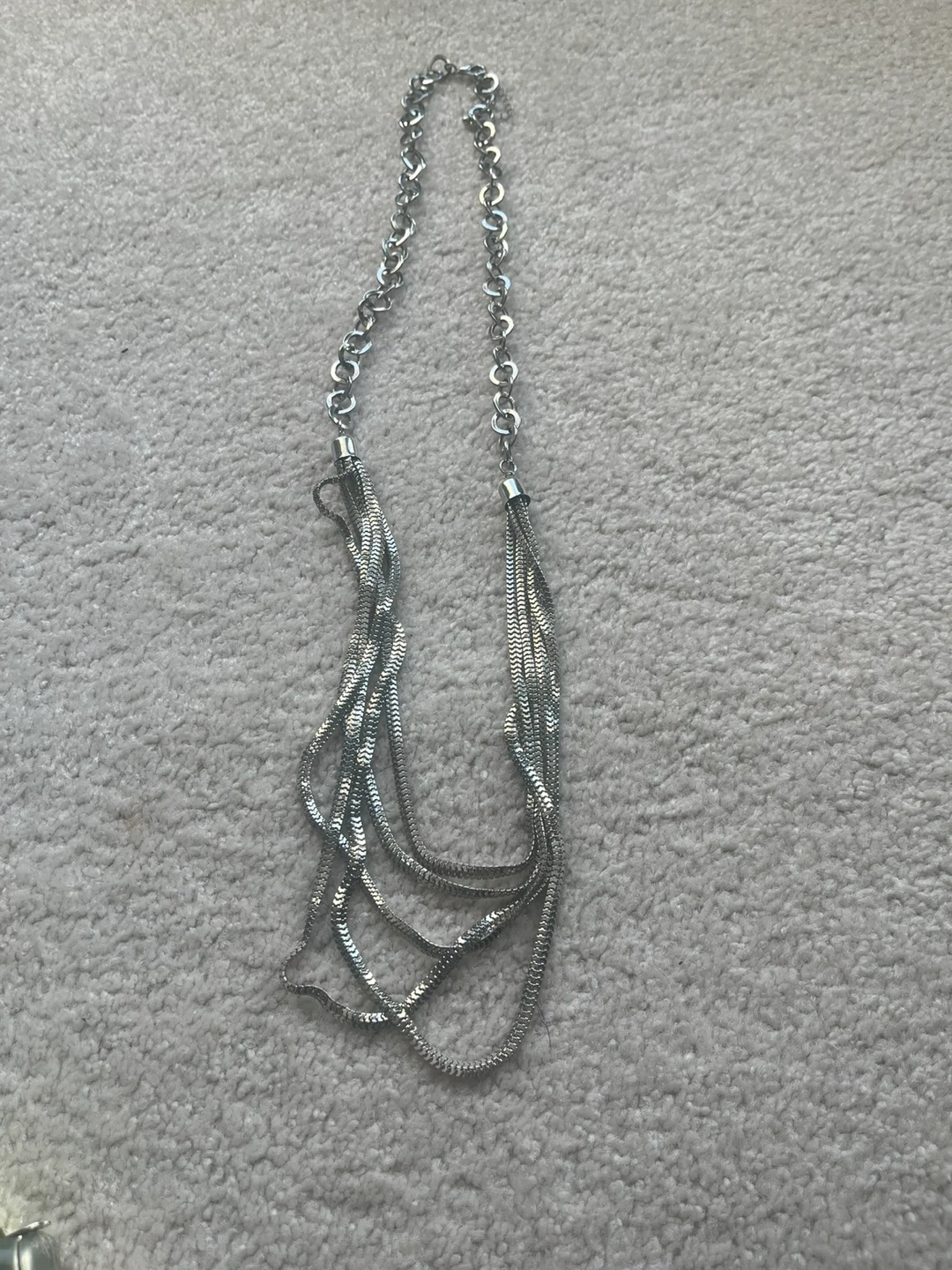 A stylish silver necklace featuring multiple delicate strands that cascade together. This piece adds a touch of elegance to any outfit. It's a great accessory for both casual and formal occasions!