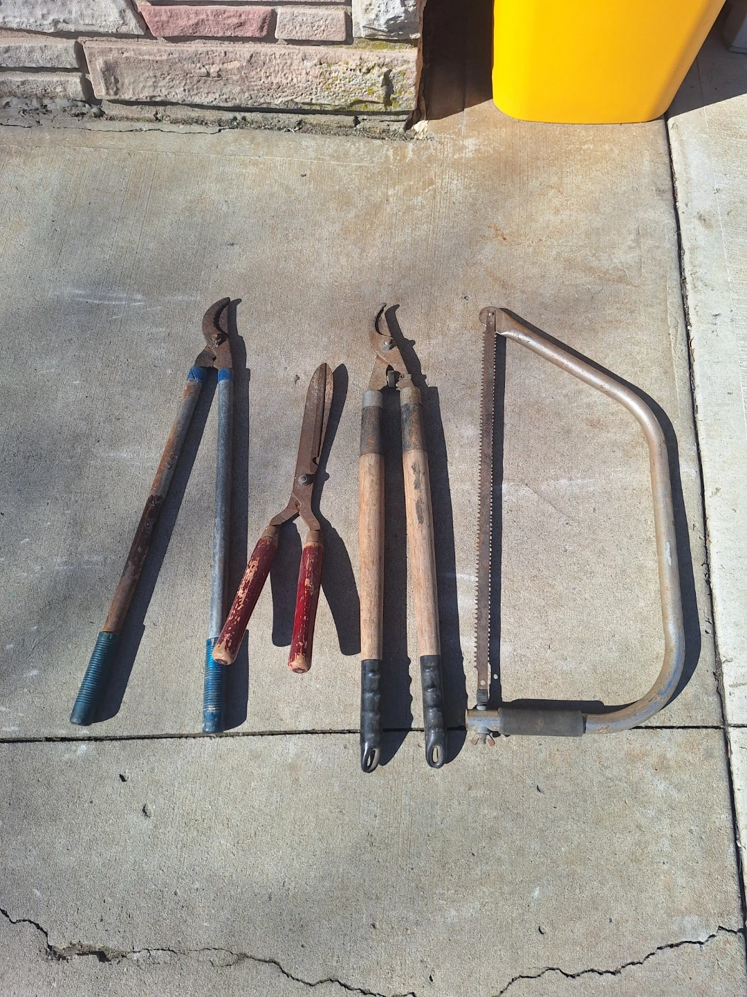 A collection of gardening tools including loppers, pruning shears, and a bow saw. Some tools have wooden handles and some are metal. These are functional tools for yard work. $10 and up